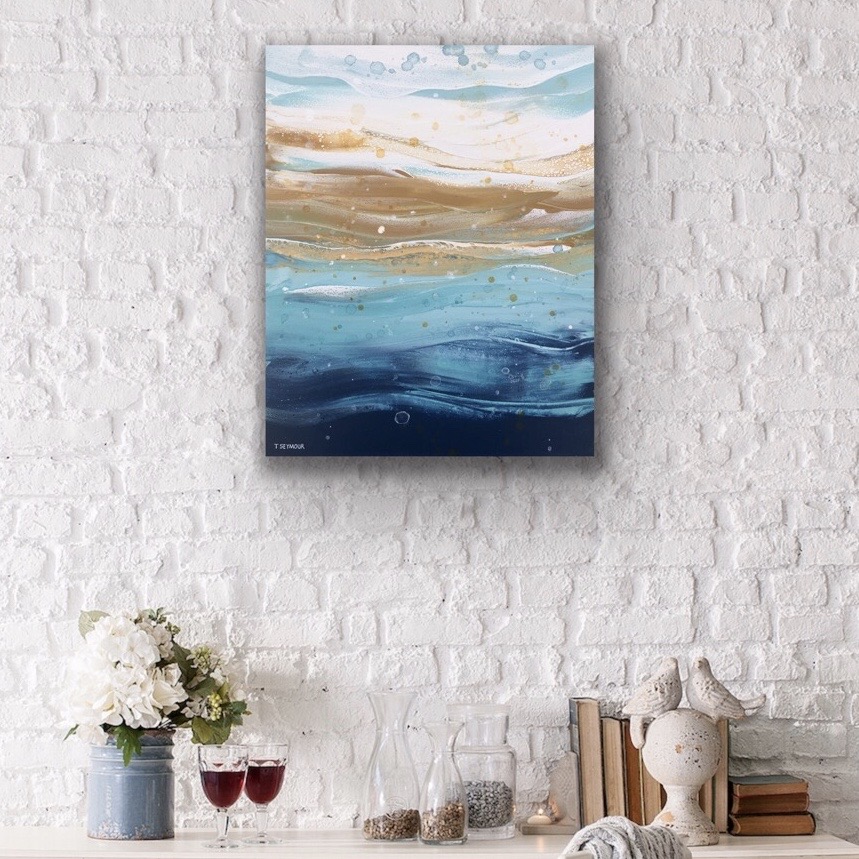 This beautiful acrylic pour is a tribute to our beautiful oceans which surround our wonderful country Australia. Depending on where you like, the ocean is different not only in looks but in habitat. Waters vary in temperature and so attract different types of marine life and ocean flora. The tides change, the sands shift, the momentum everlasting.