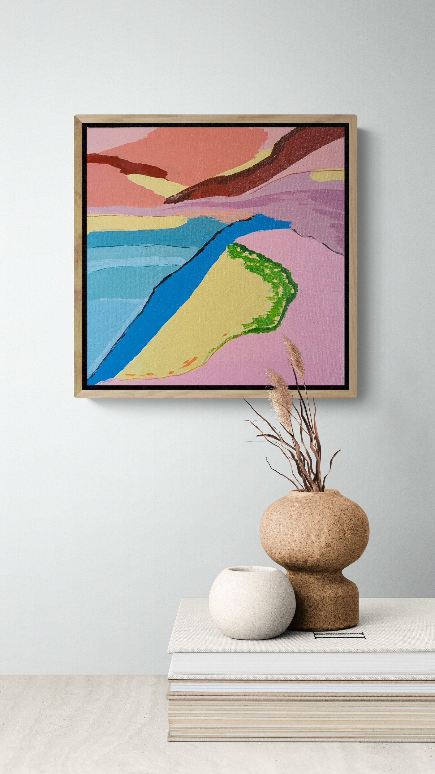 This painting captures the essence of transformation and the fluidity of nature. Through soft, flowing forms and vibrant yet harmonious colors, the artwork reflects the interaction between land, water, and sky. The juxtaposition of structured and organic shapes symbolizes the balance between stability and change, inviting the viewer to contemplate the cycles of renewal and connection found in the natural world.