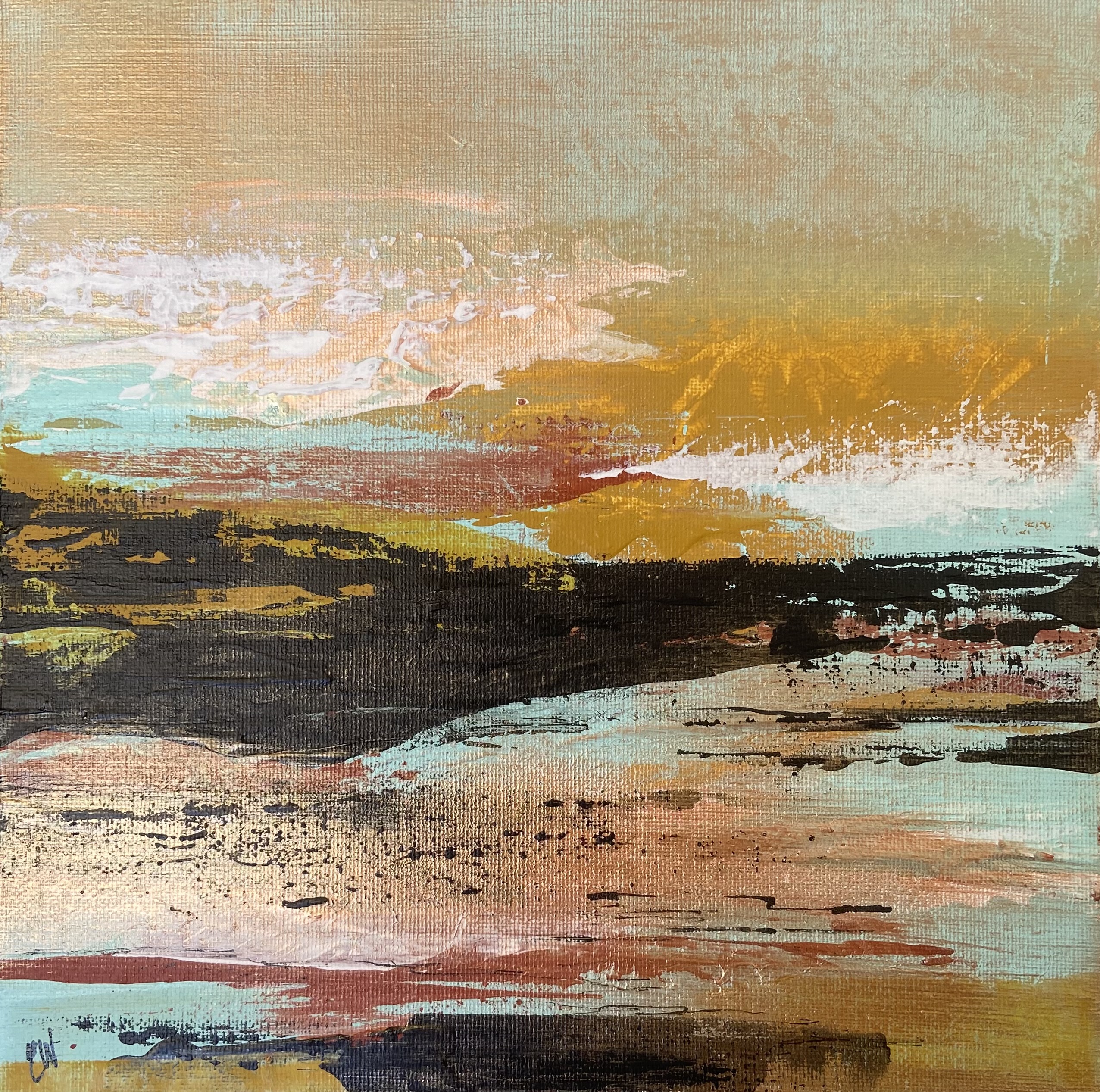 Shimmer by Carrie Welsh is an abstract landscape piece with beautiful metallic details. 25 x 25 cm. Acrylic on canvas, ready to hang. Frame not included.
