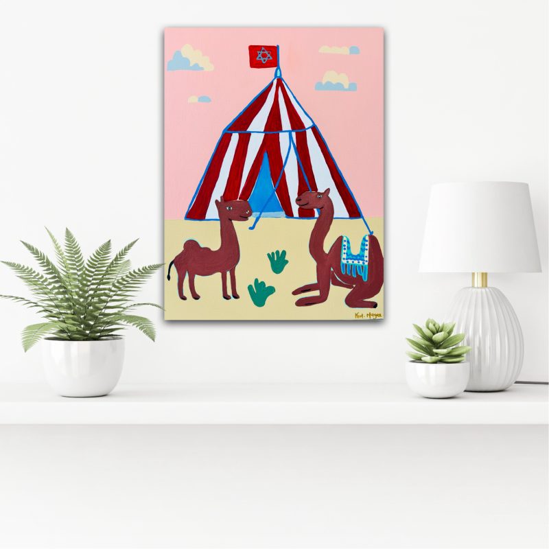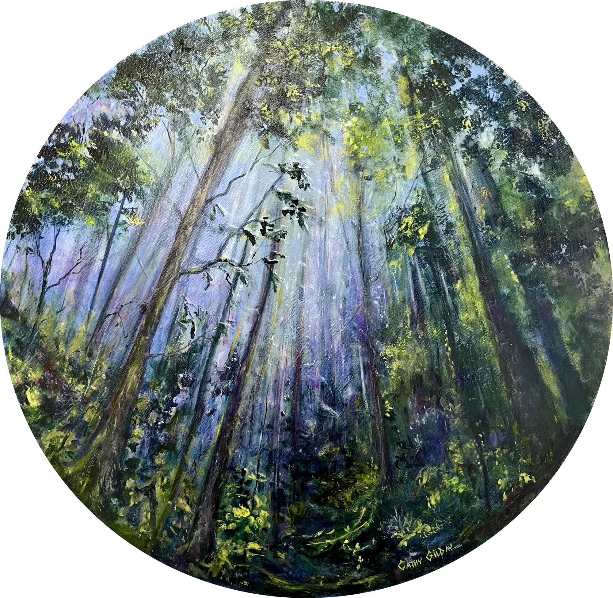 This impressionistic piece was inspired by my love of trees and nature. Painted on a circular canvas board, I used an upward perspective, following the tree trunks up to a leafy canopy, capturing the shimmering light that filters through a shadowy rainforest. Sides painted, sealed.