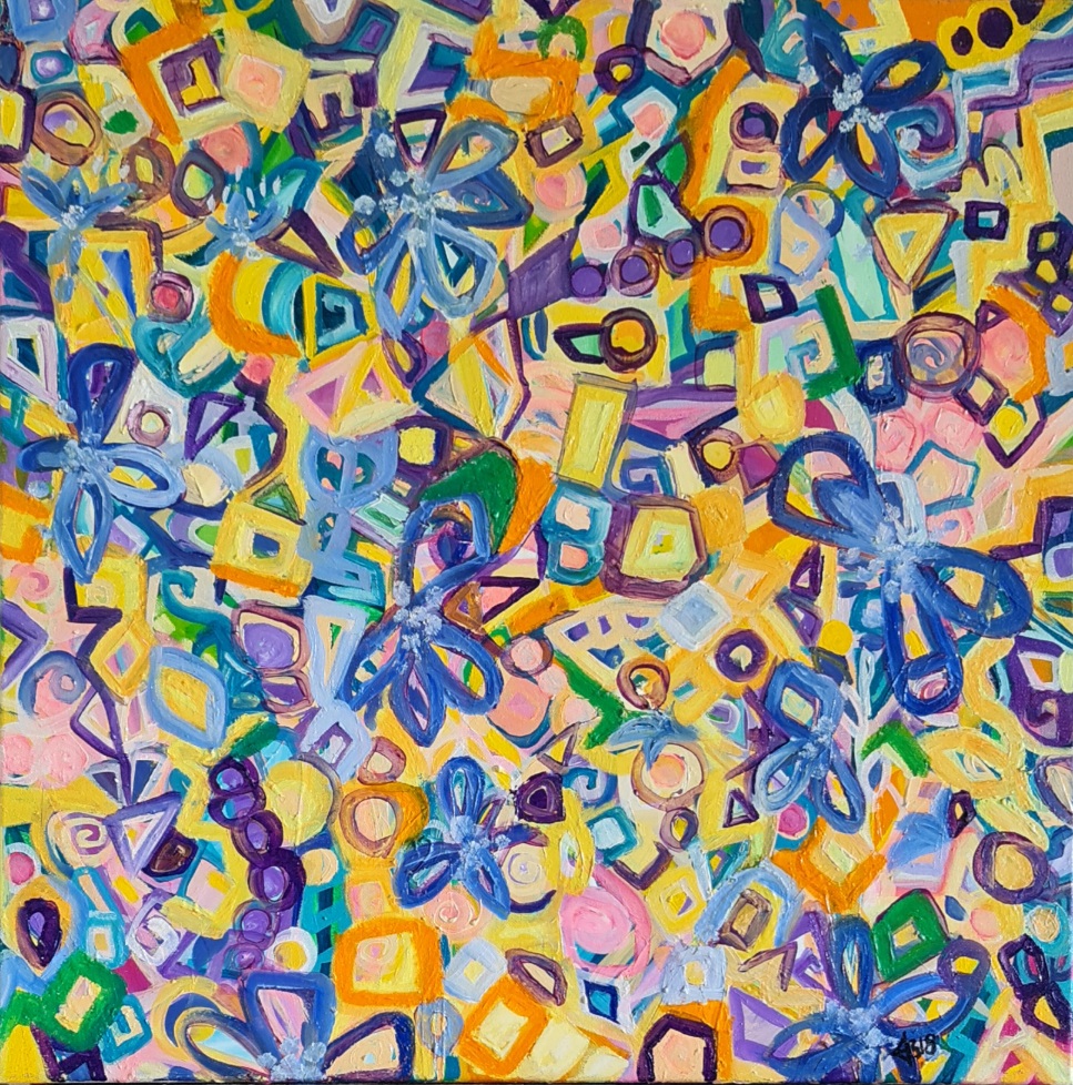 An abstract action painting, where I just let go and allow the artwork to emerge and tell me a story. There is no pressure nor expectation of what it becomes. I really just let go and enjoy the evolution through the act of applying colour and of painting. My abstract pieces are heavily based on my own thoughts and feelings, explored through colour and design.