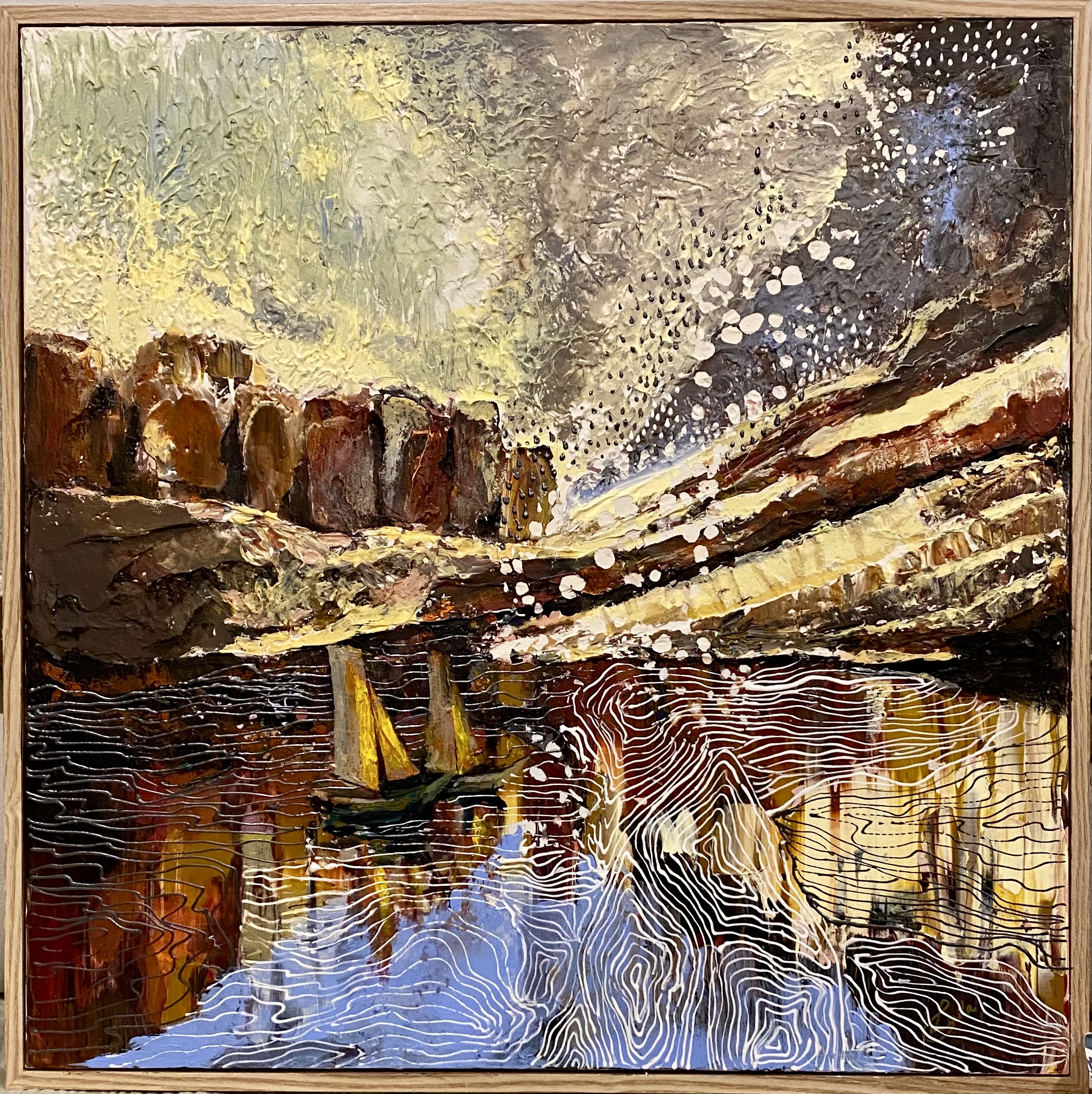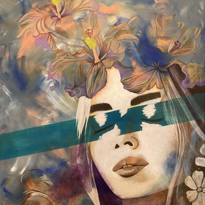One of a kind mixed painting combining acrylic painting with plaster art.