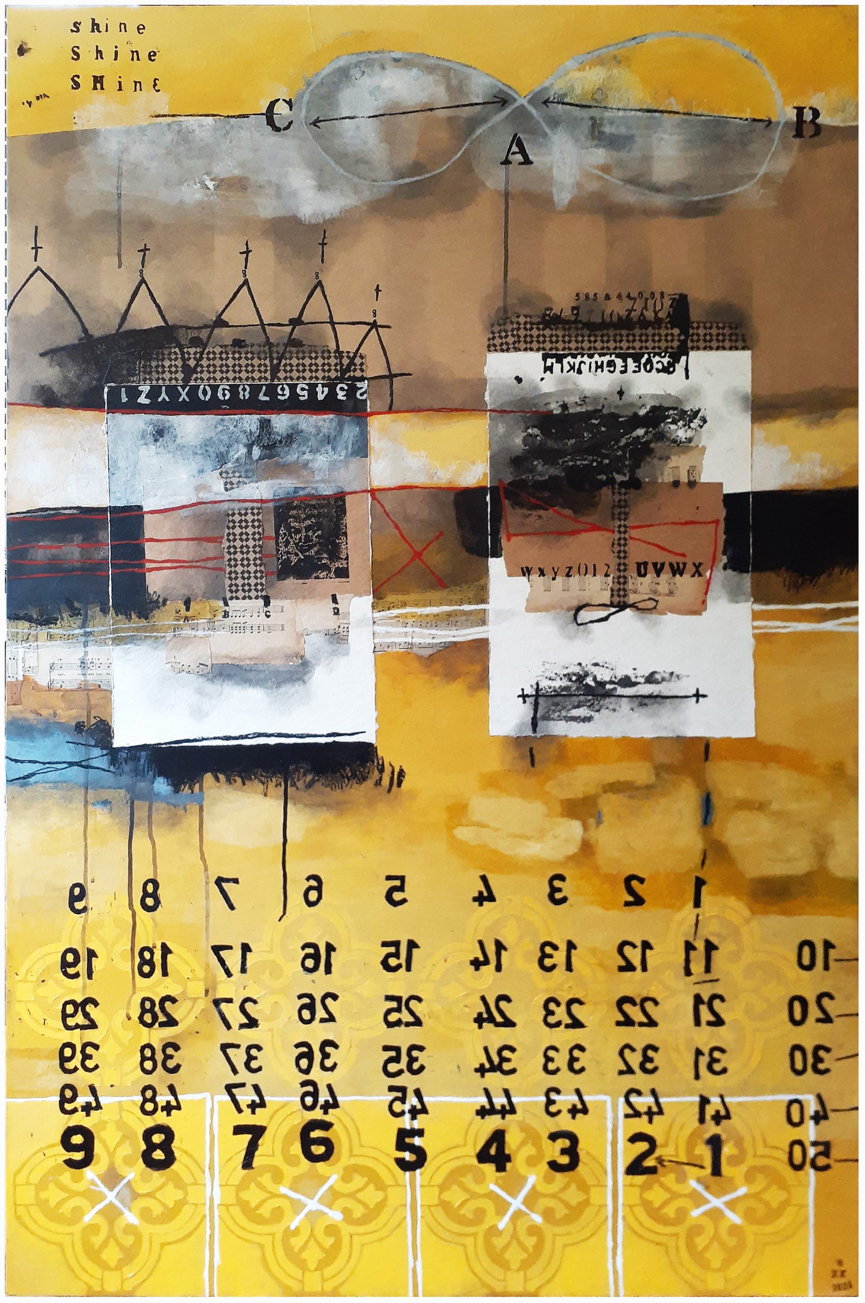 Shine, Shine, Shine by G Kustom Kuhl – Original mixed media artwork. The work includes pencils [various & layered], inks, paint, stencil work, papers, collage and vintage printing plates. The artwork relates to the notion of breaking older patterns and setting up solid foundations for a new life. A life that revolves around the internal intuition that we have but sometimes refuse to listen to. This work is about the internal shine you reflect out when in this state of mind/ emotional state. Signed at the bottom of work and backside. Supplied with a certificate of authenticity.