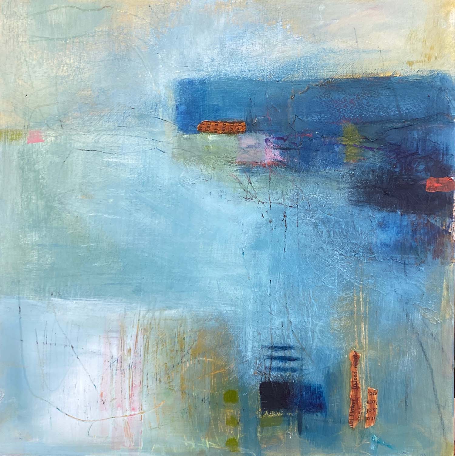 Shipping Lanes is a busy, purposeful painting, in tranquil blues depicting the sea traffic between the headlands of the bay. Â Using texture and mark making with mixed media this small, intimate painting has a floating, buoyant feel. Â It’s size is perfect for a gallery hang or to display of a shelf or cabinet.