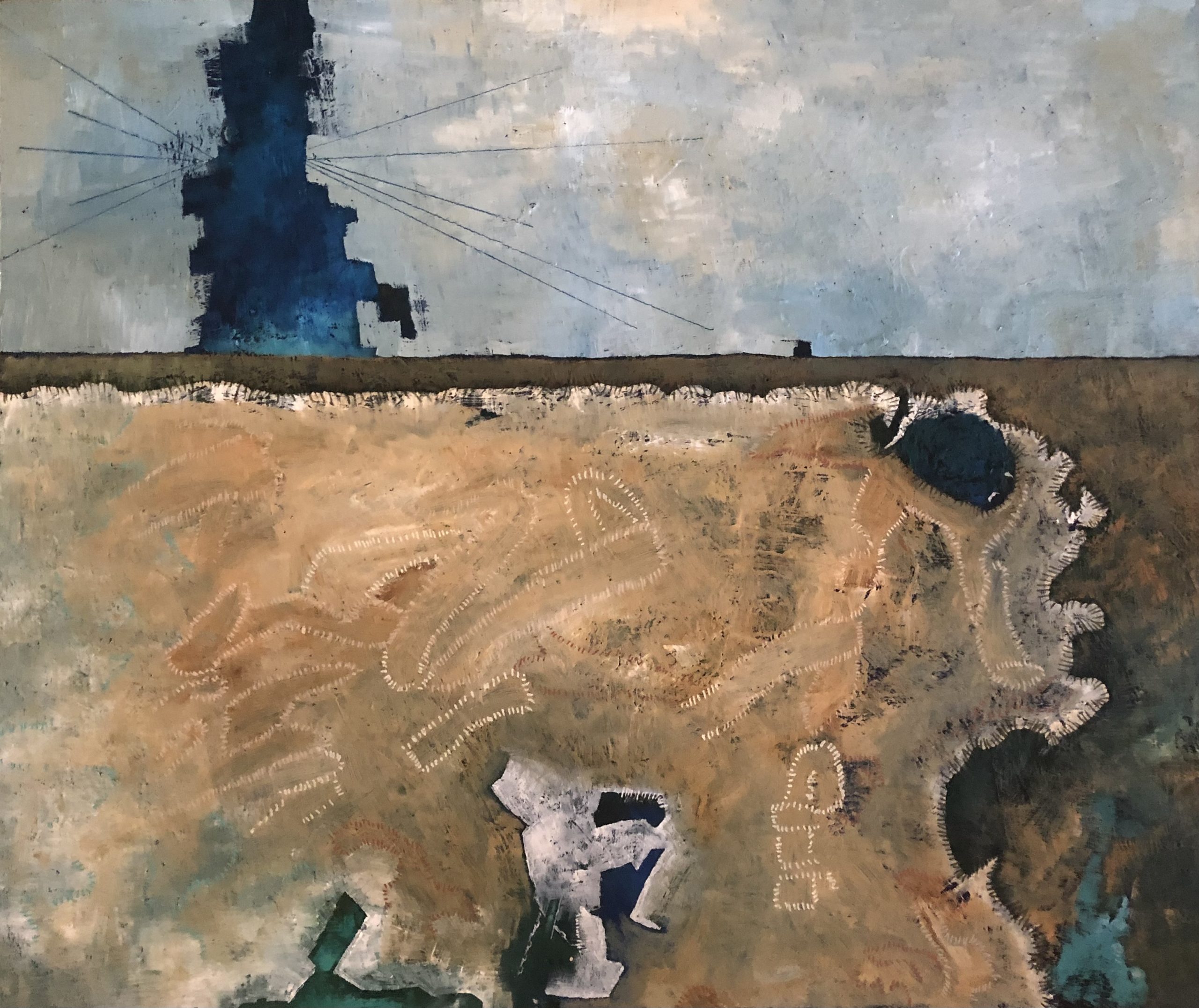 Shipwreck by Erica Davis. Abstracted  shipwreck with lighthouse and coastline. There are lines representing the stitching on the sails, incised lines representing the ineffectual lighthouse beams in a moody sky.