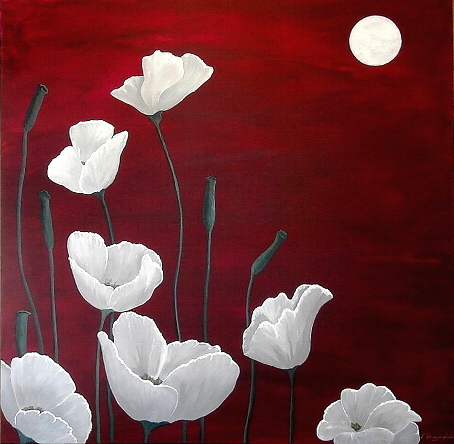 White poppies swaying in the breeze remind me of ballerinas dancing. This painting is my colour journey of burgundy and white to capture the essence of graceful ballerinas performing a ballet on stage in a grand theatre.