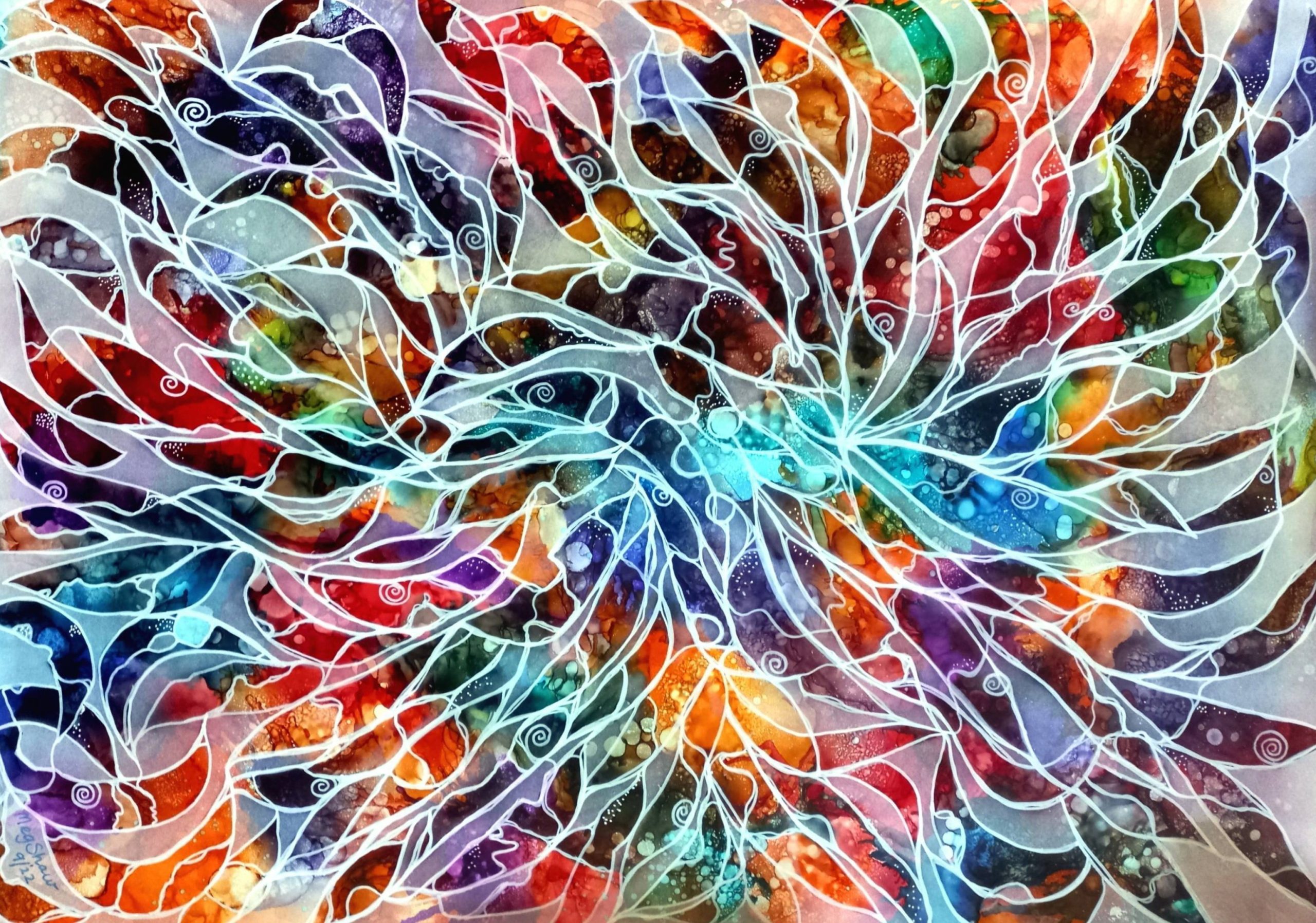 Shock of Colour – Forest Floor Series No 5 by Meg Shaw – This is a large, mixed media, negative space painting on yupo paper. I’ve used a brightly coloured ink base, then worked white paint around multiple leaf shapes. A normal painting is done in positive space, but negative space paintings give an interesting and different perspective. I tried to create movement by laying out the leaves in a sunray display and outlining them with a white pen. Along with the strong colours, this piece would make a bold statement in your home.