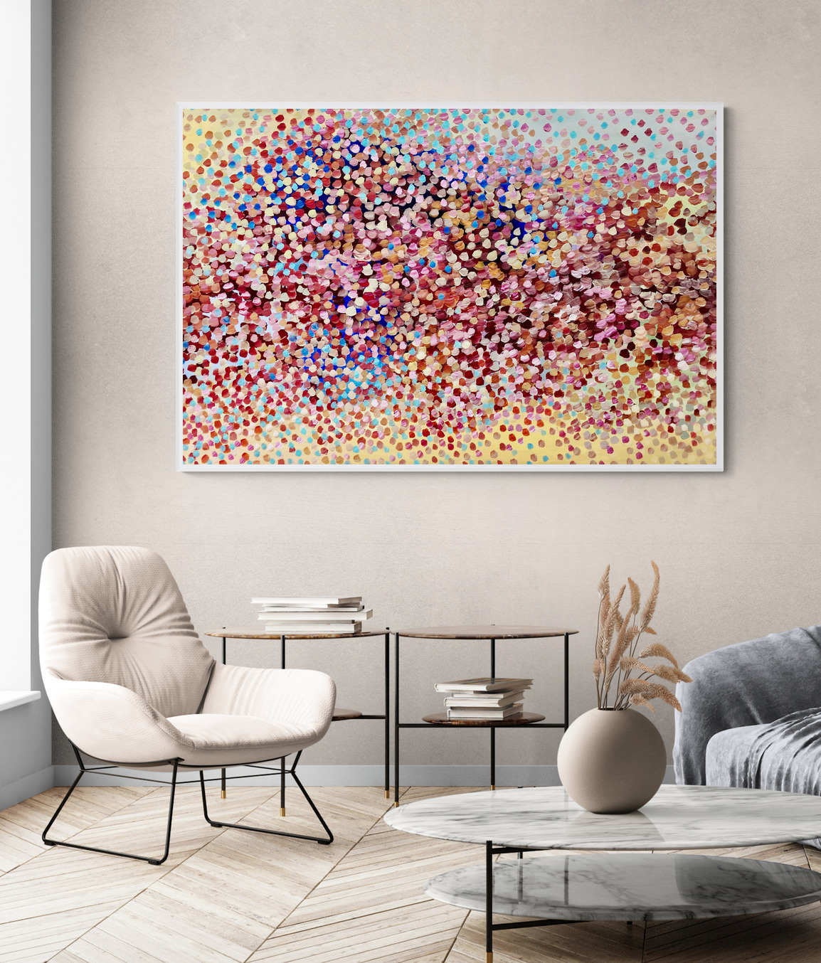 Shooting Stars a painting with beautiful warm and cool colours of petals flying in the wind dancing in the Sky. Petals weeping onto the landscape creating this beautiful veil of colours covering the whole landscape . Petals like sparkling stars shooting into the sky creating a beautiful bouquet of Petals. A composition of rich colours and rhythms of petals dancing over the landscape like musical notes. A very peaceful and tranquil painting with so much depth . This painting is painted on canvas and does not come with an external frame .The painting is signed and dated 2022 at the back and comes with a certificate of authenticity.