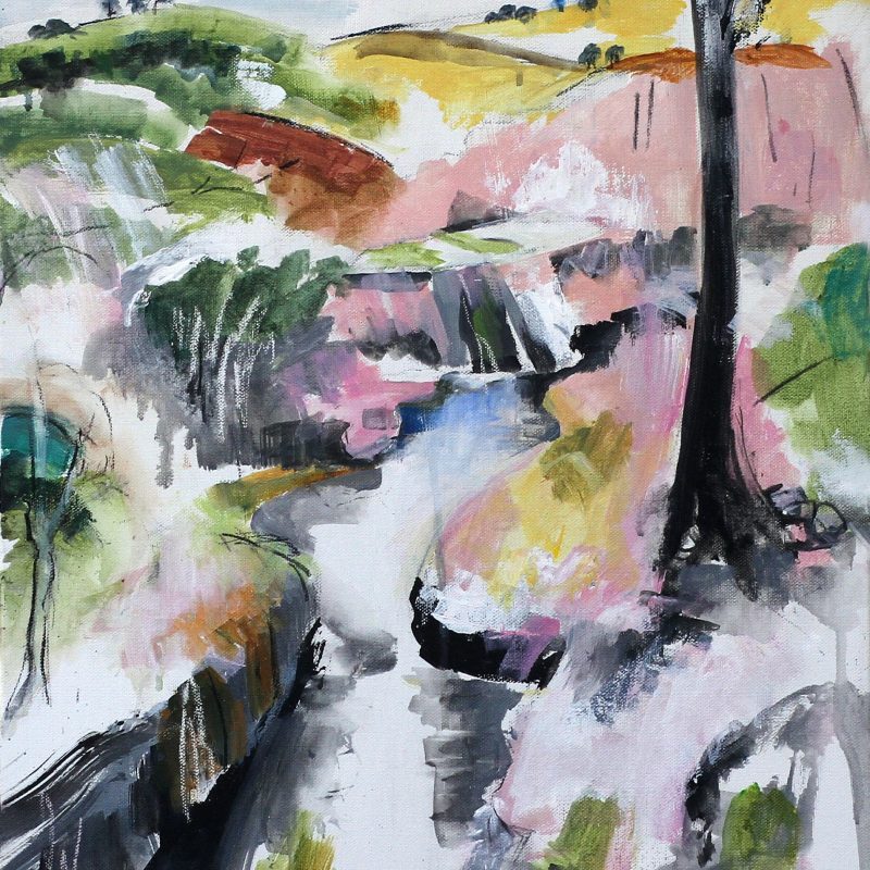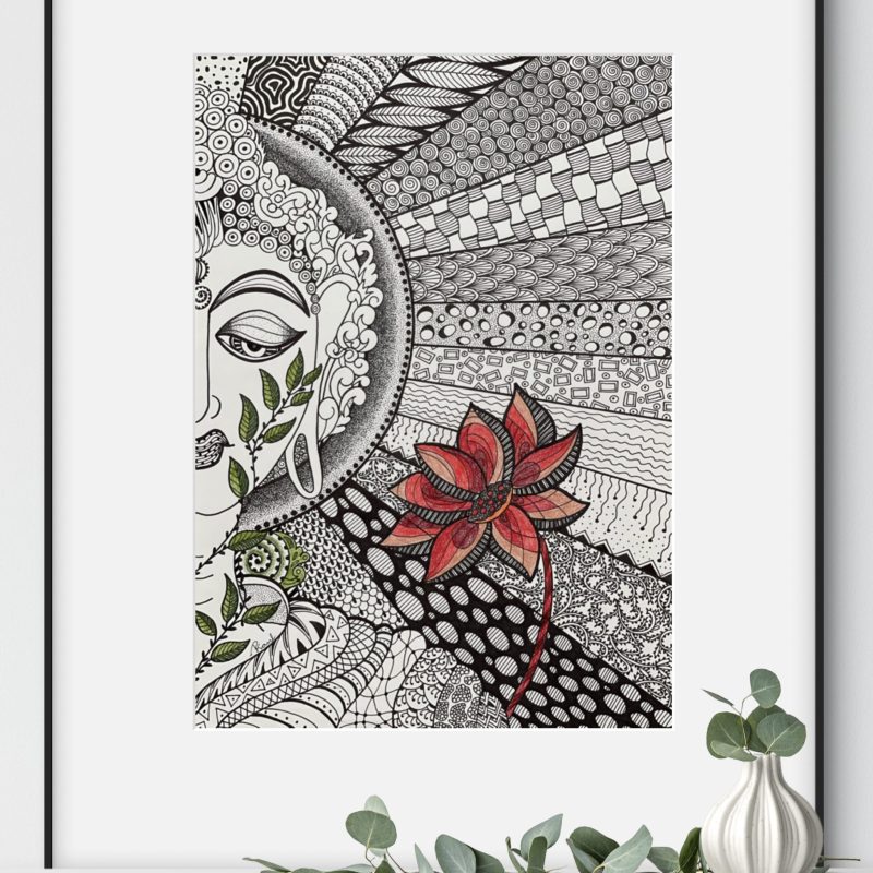 The work was created on cardboard and comes framed in black and ready to hang, and it is mounted under a clear acrylic sheet.
