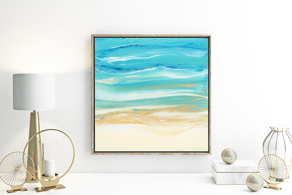 This stunning art reflects the vast expanse of Victoria’s 90 Mile Beach. As I child, I spent many holidays with my parents down at a place called Sea Spray. A small town with a general store selling petrol, bait, food, newspapers as well as acting as the post office. There were little beach houses dotted everywhere and a caravan park on the shoreline. Our family used their own caravan and liked to venture away from town and locate behind the sand dunes in a quiet secluded spot away from the noice of the fellow campers and town folk. One vivid memory which inspired me to create this triptych was the vast expanse of shoreline with absolutely no one on, in or around it. The sand had no footprints, the ocean had no surfers or boats occupying it. There were no fishermen nor sunbathers. Only seagulls on occasions. It was like a completely deserted beach. A rare sight indeed and I hope you are transported to that same beach whilst studying this art.