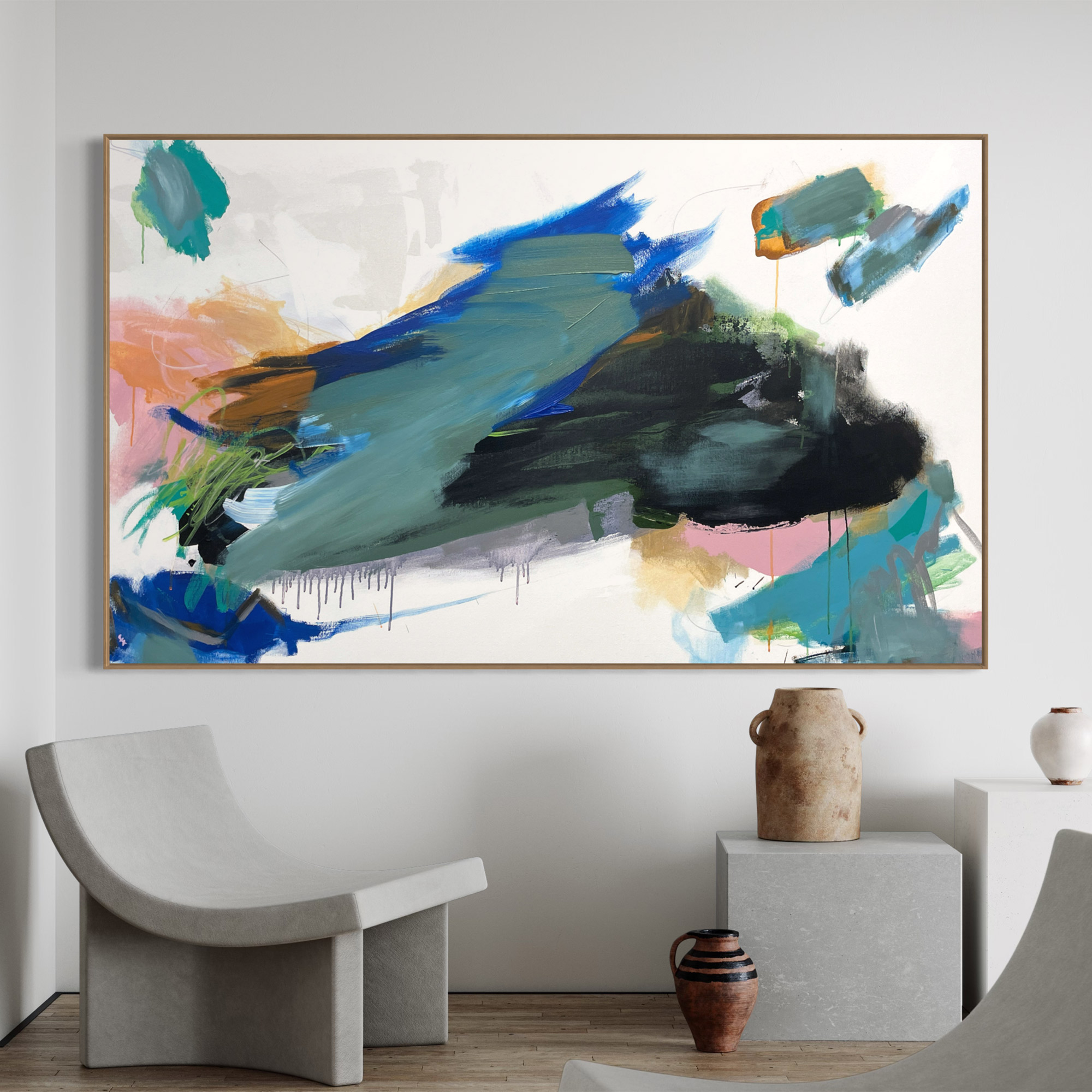 It’s a fun uplifting piece. It’s intriguing mark making combined with its striking palette of beautiful soft apricot, blush and pinks, sage, olive green and orange, mixed with white and neutral tones all dancing around bold blues and black with grey and coloured line work.