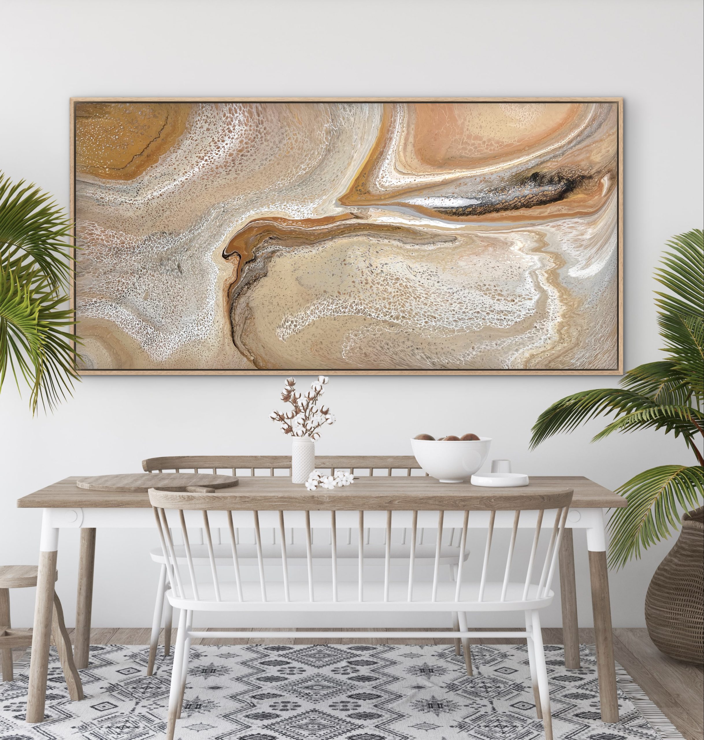 Created with layered fluid techniques that allow pigments to flow and blend naturally, forming soft movement and organic detail across the surface. Subtle metallics catch the light, adding a gentle shimmer that shifts throughout the day.