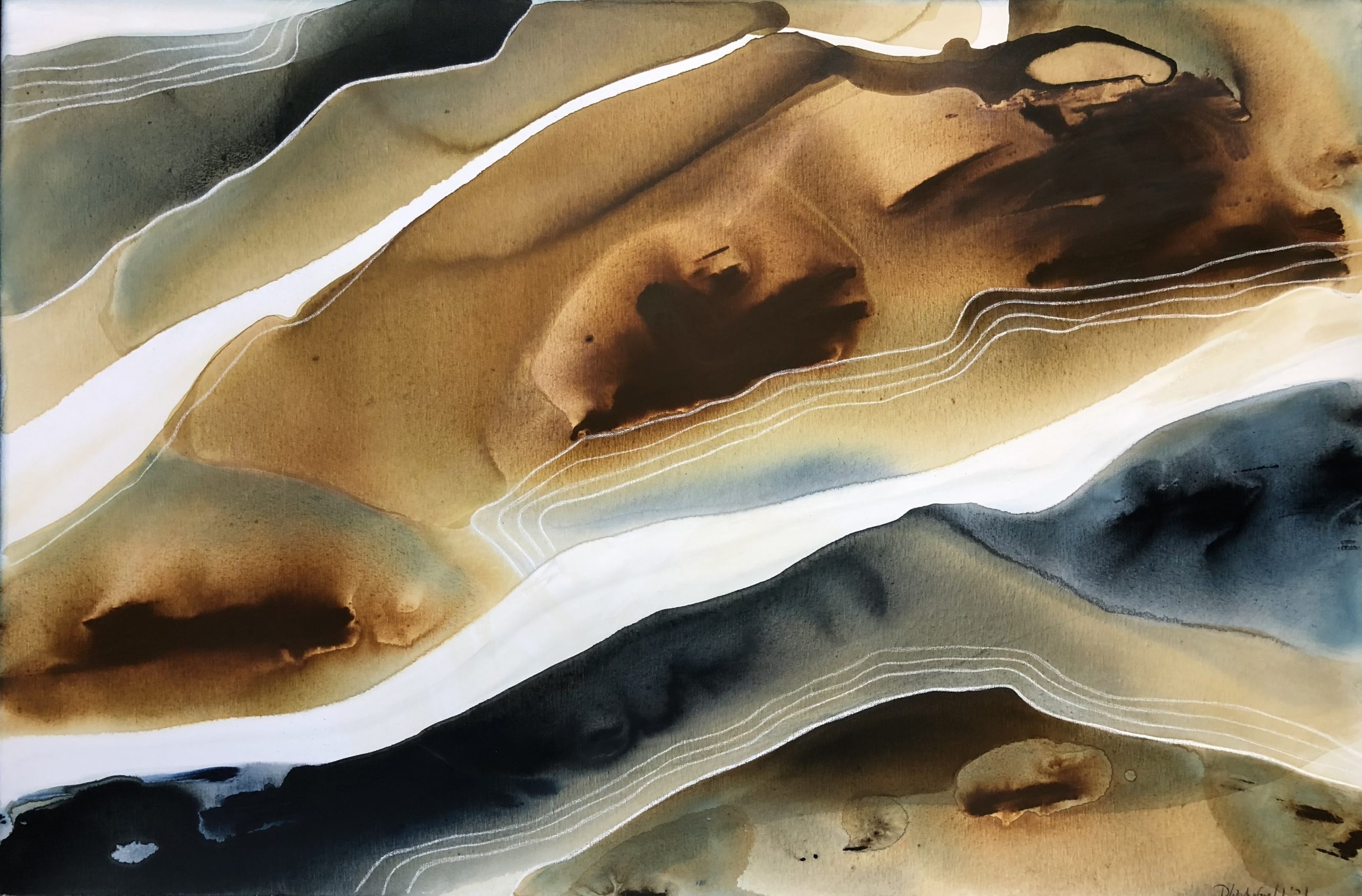 Sierra 2 by Dinah Wakefield is inspired by the light, the colours and the natural beauty of the Noosa region of Australia. “What I love most about Noosa is the interplay of light. From the oceans to the clouds, to the river estuaries and the hinterland, this canvas unfolds before me every day and finds expression in my paintings”.