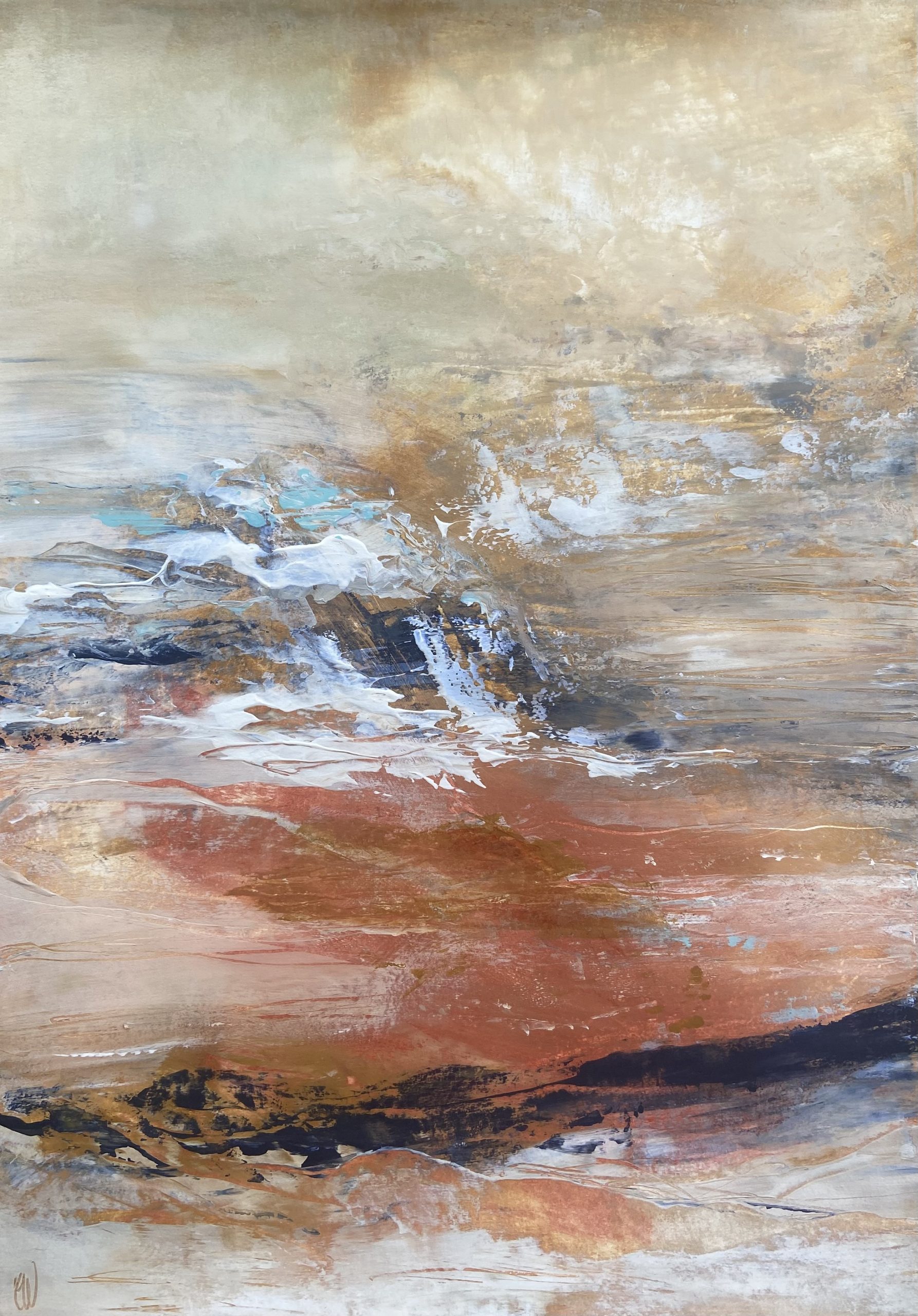 An abstract landscape painting that has beautiful earthy tones. 59.4 x 42 cm (A2 size). Acrylic on paper. Frame not included. Requires framing.