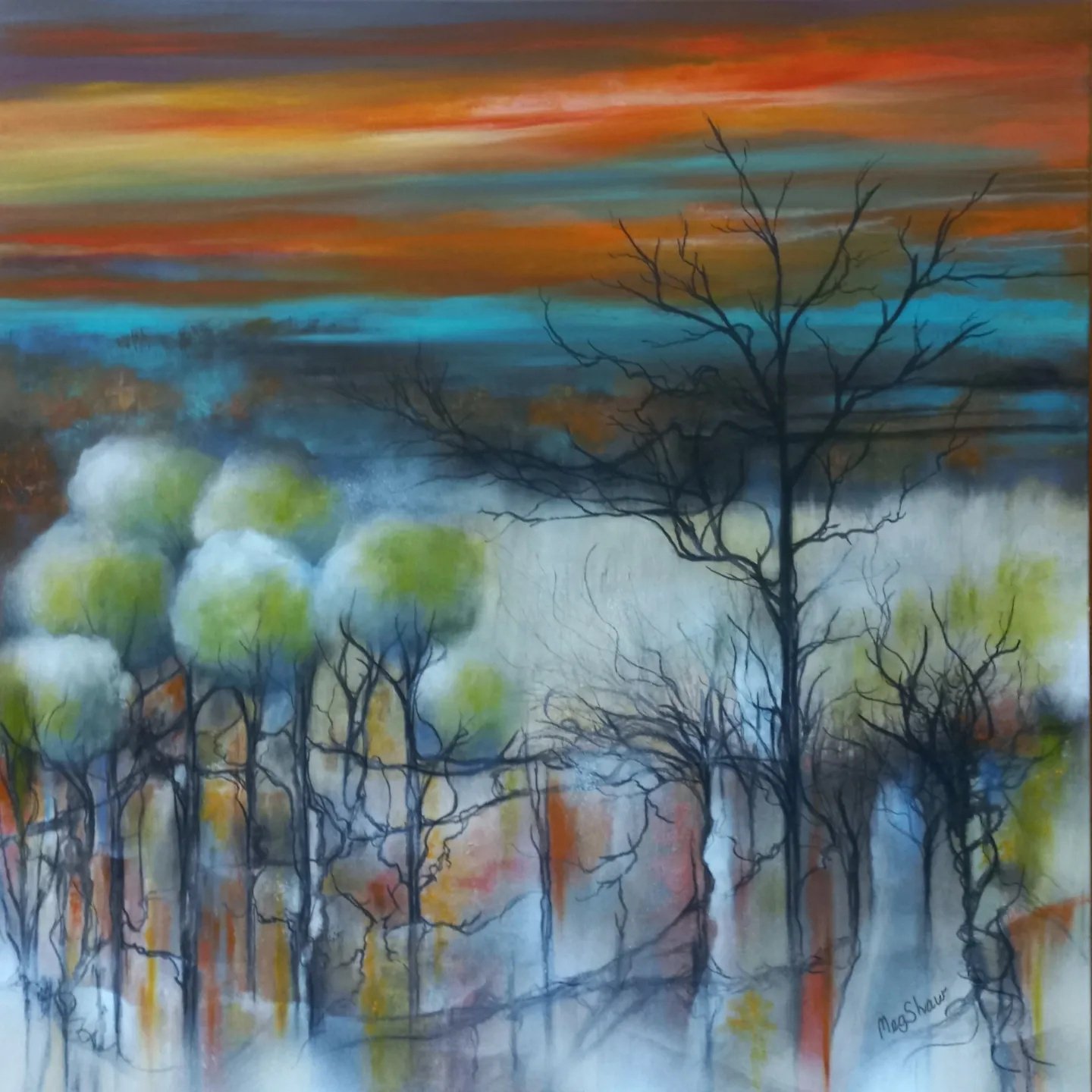‘Silent Dusk’Â has been painted on stretched canvas using acrylic paints, inks and charcoal. Brushes, palette knives, dabbing rags and my fingers were used to create a layered and textured piece. The surface has been sealed with a lacquer finish for protection. It measures approximately 94 x 94 x 4 cm and it’s framed in Tasmanian Oak. For care, wipe gently with soft cloth and keep out of direct sunlight.