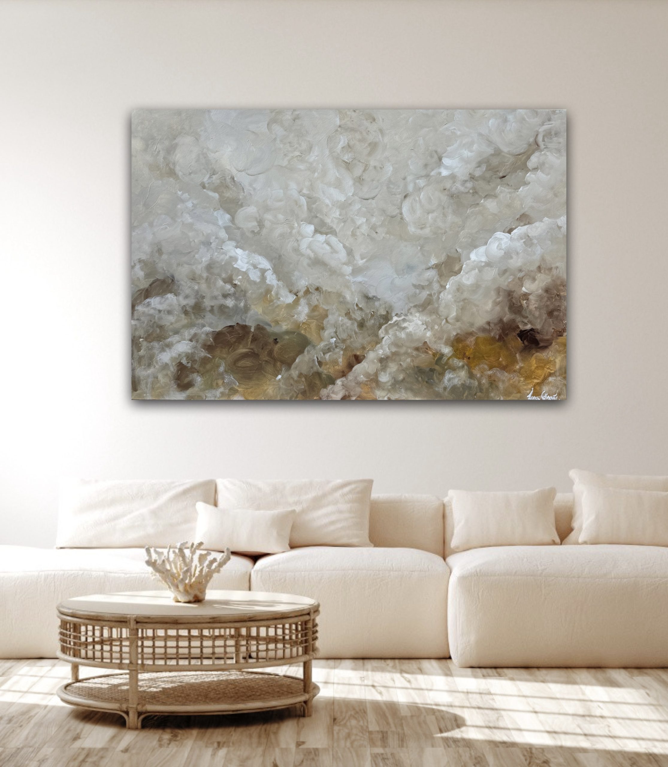 Step into a world where softness meets depth. This abstract piece evokes a gentle rise of morning mist over an earthy field. An ethereal blend of ivory whites, beige clouds and golden undertones, brings a sense of serenity and warmth to any space. Perfect in creating a calm, elegant and inviting atmosphere.