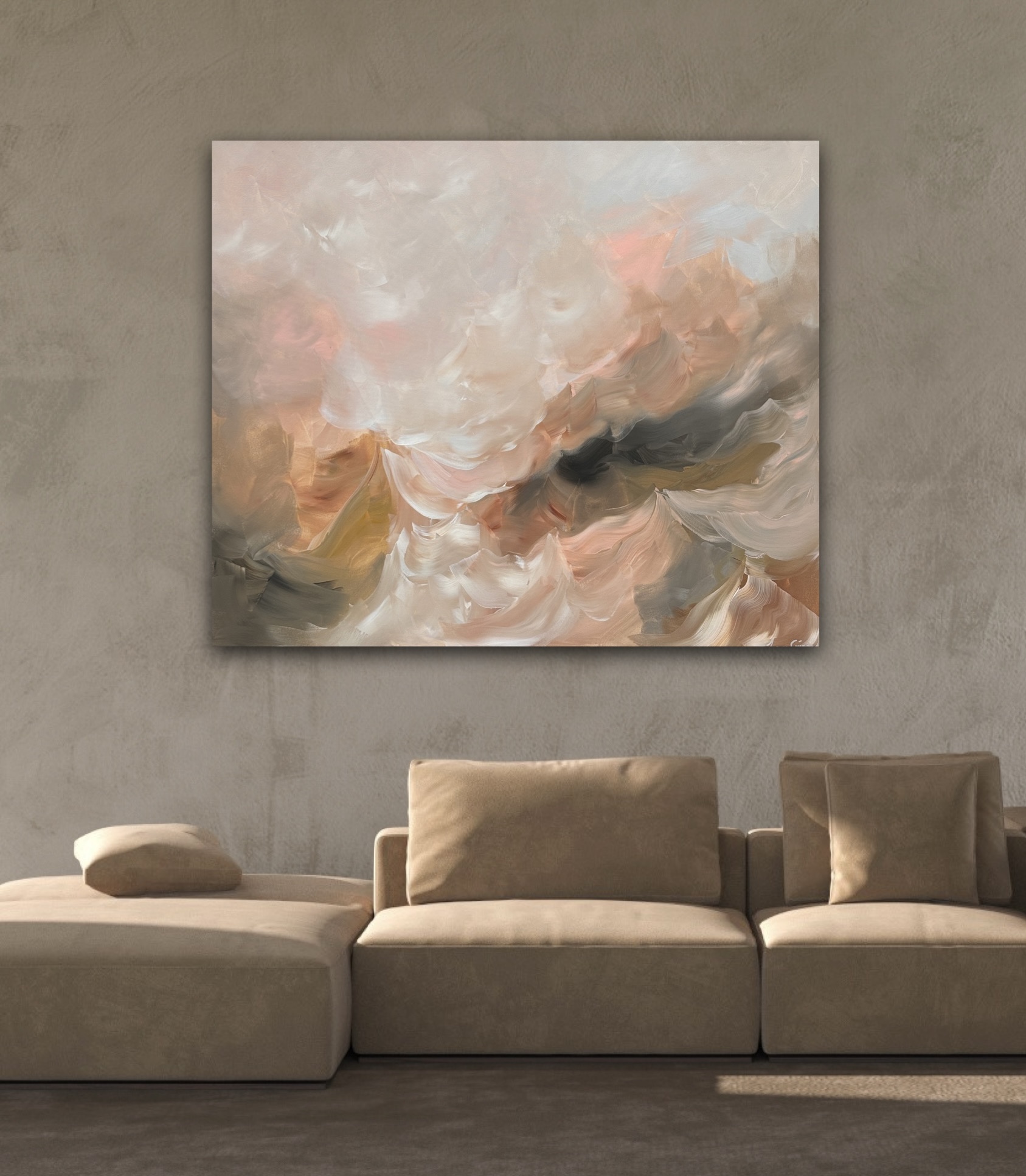 This abstract artwork features a warm, earthy palette with rich browns, deep charcoal and soft apricot tones. The composition creating a grounding natural warmth and a welcoming feel.