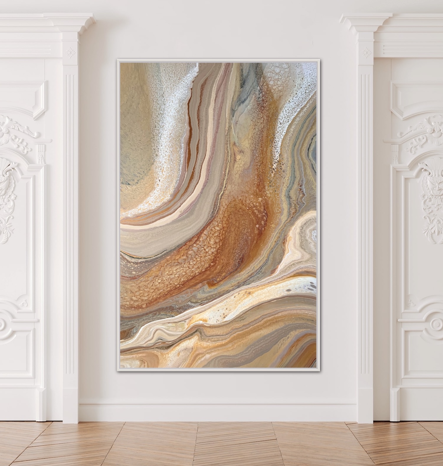 Silk Road was created using various techniques combined to allow increased flow, interaction and separation of colours to create interesting patterns where pops of colour can be seen emerging from underneath. This added dimension adds lace and cells to the artwork creating an interesting and one of a kind painting that can never be replicated. A gorgeous variety acrylic pigments were used including metallic yellow and warm gold, cream, beige, brown, bronze, silver, grey, black, rose gold and white.