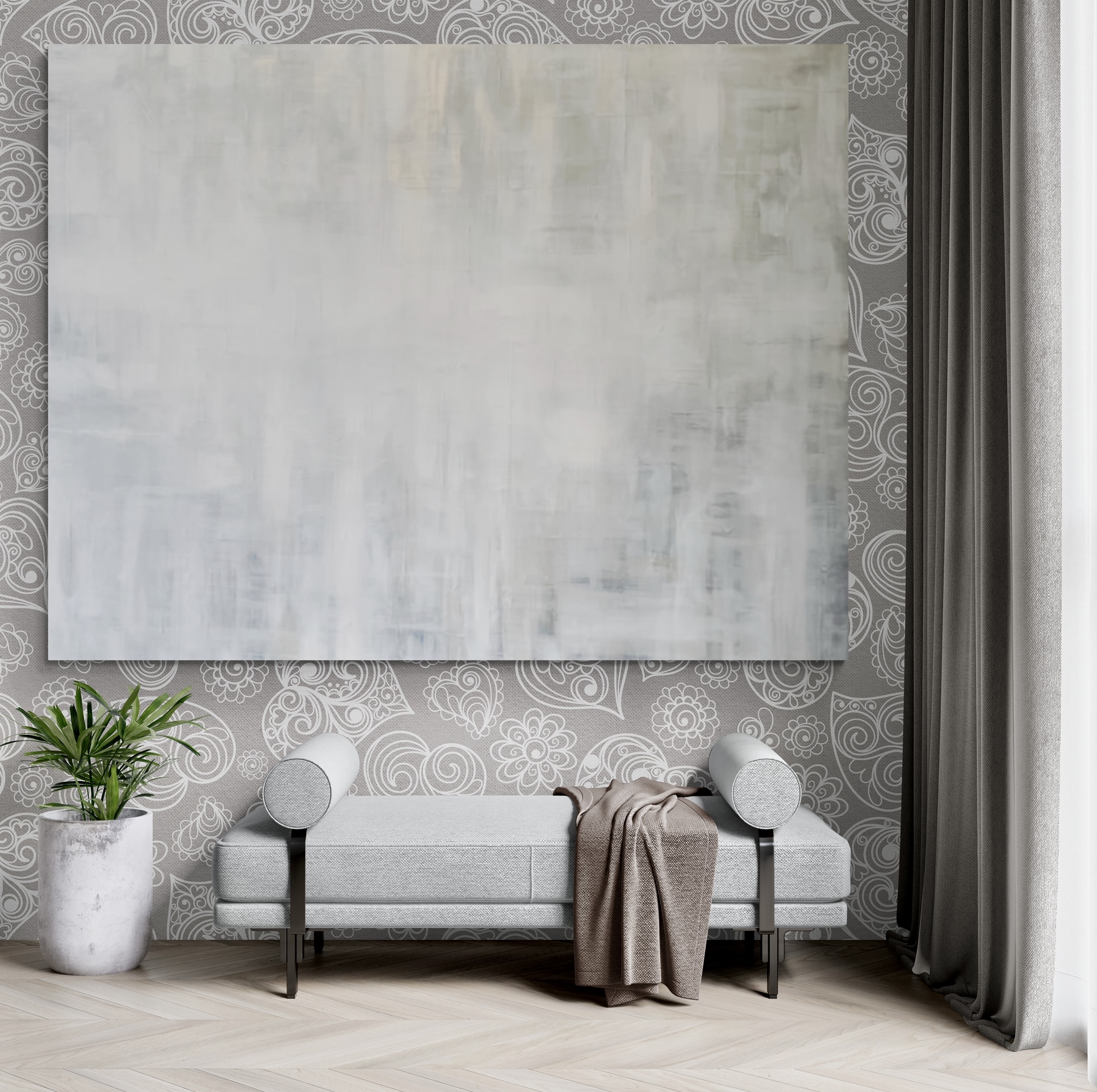 Extra large original abstract in silver with grayscale shades and white highlights. Metallic textured finished.