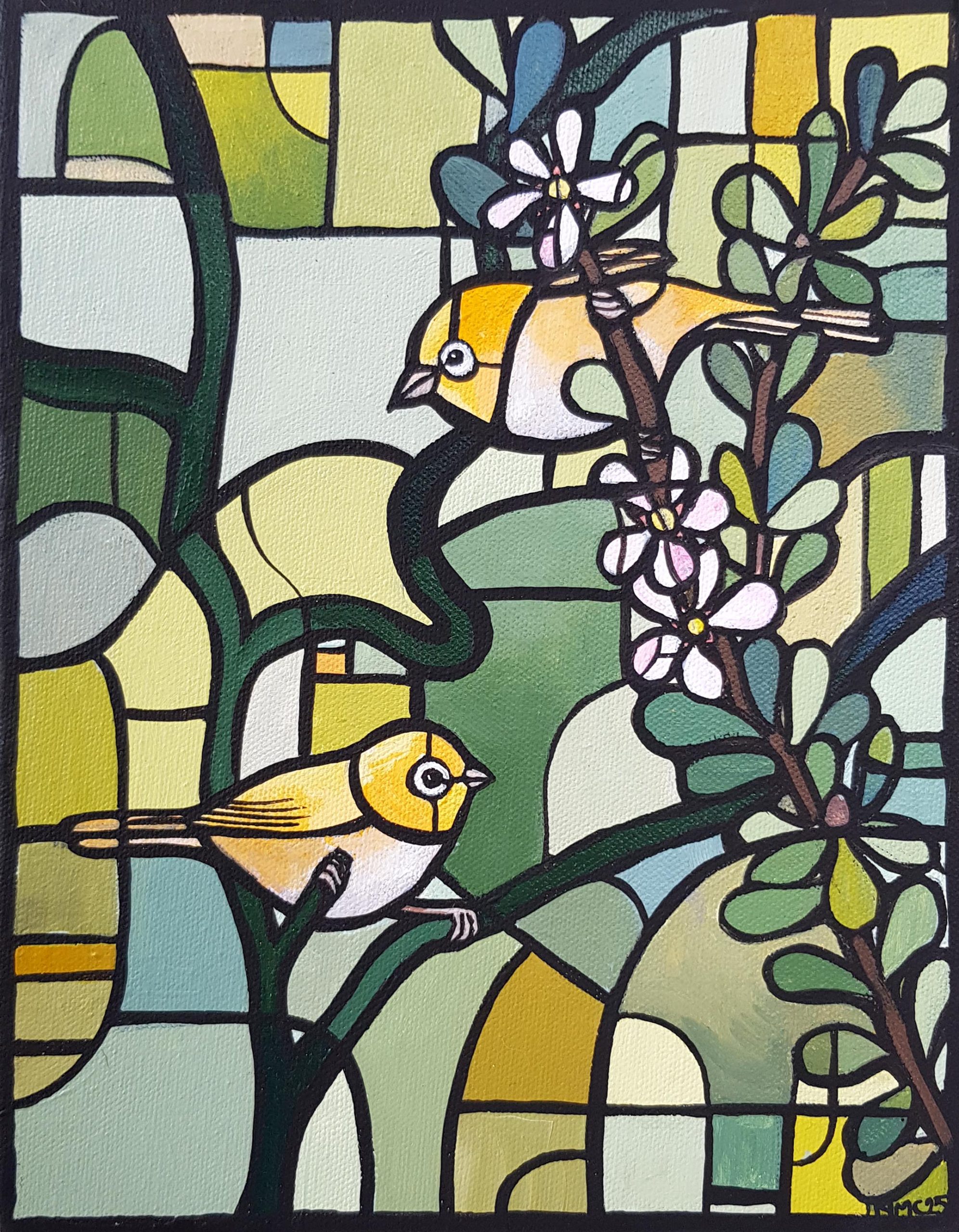 Two sweet birds are perched on branches with tea tree flowers. The painting is made up of organic shapes and filled with an array of yellows and greens.