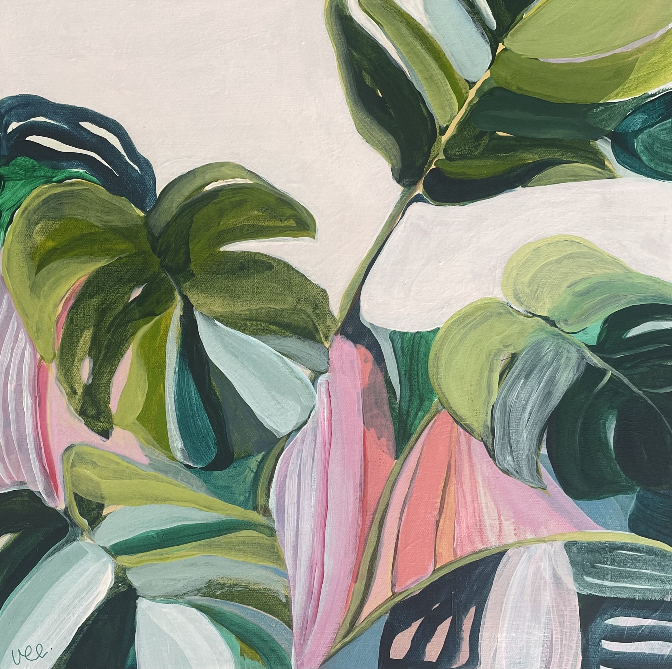 Exploring textures and colour, Vanessa’s abstract botanical ‘Silver Lining’ brings together bright pinks and fresh greens of nature to create an artwork full of joy.