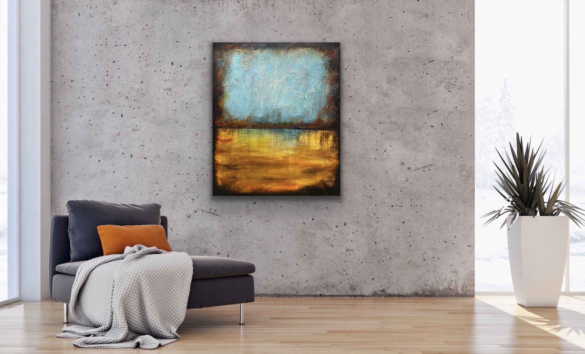 This abstract piece is inspired by Rothko whom I love such depth of colour in this artwork which would be a standout on any wall with the warm rich Red Oxide, blacks,Sienna along with the cool aqua hues.