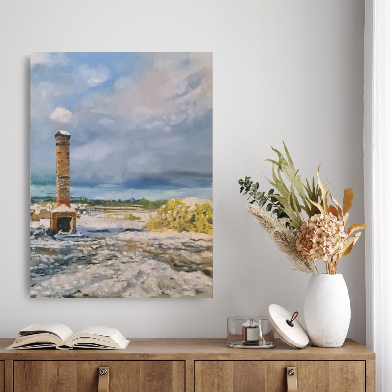 Framed in Tasmanian Oak, the edges have been painted to ensure no blank canvas is seen.