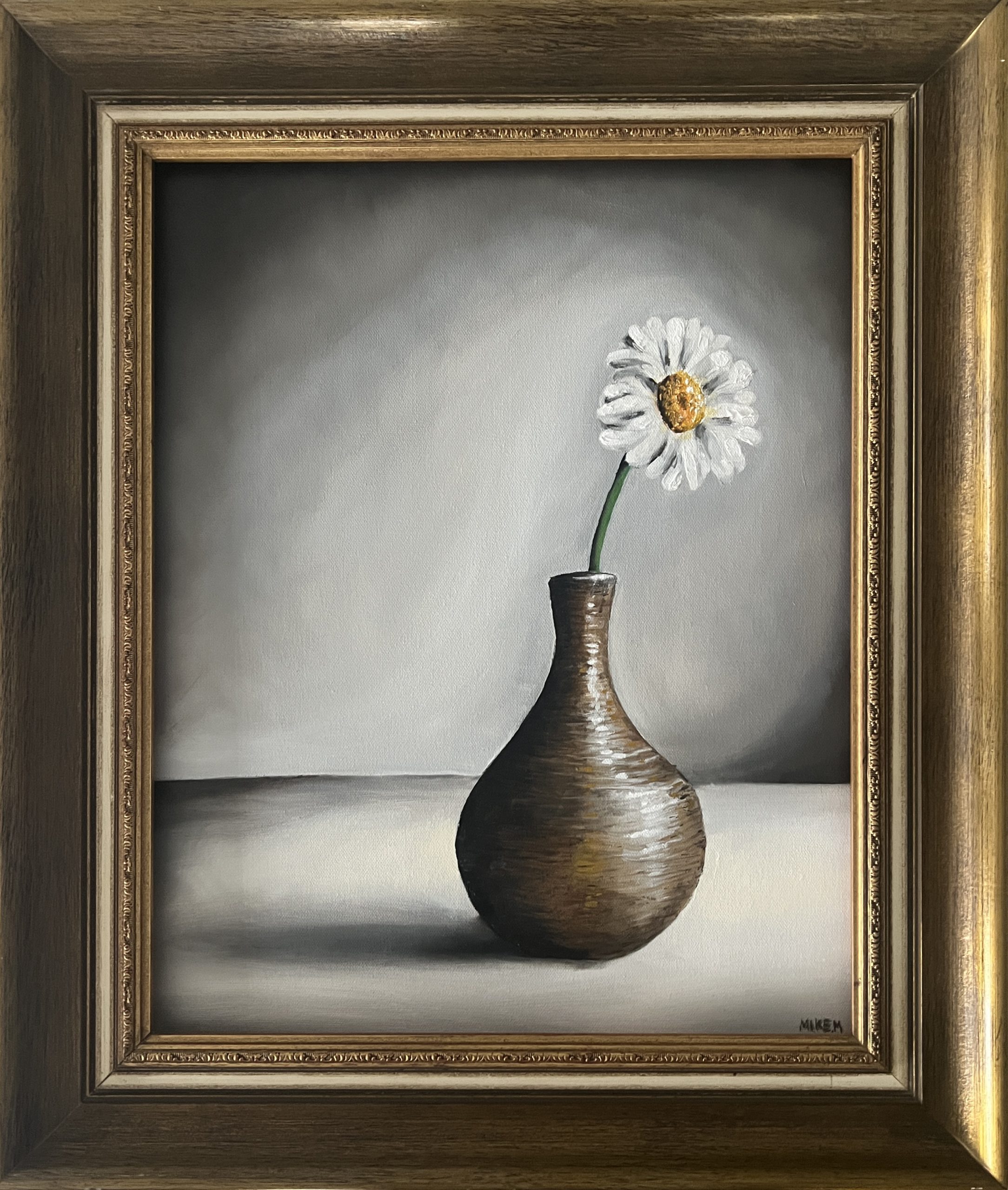 The simplicity of the subject draws the eye inward, revealing a harmony of understated yet captivating colors—tones that feel soothing and refined, yet vibrant enough to command attention. Blending modern technology with traditional artistry, the process begins with an AI-generated reference image, which serves as inspiration rather than a blueprint. From there, the artist reimagines the concept on canvas, refining every detail with care. The final work—an oil painting on canvas board finished with a gloss varnish—amplifies the richness of the hues and the luminous quality of the light, making the flower appear alive in its stillness. It is a celebration of purity and grace, expressed through color, light, and form.