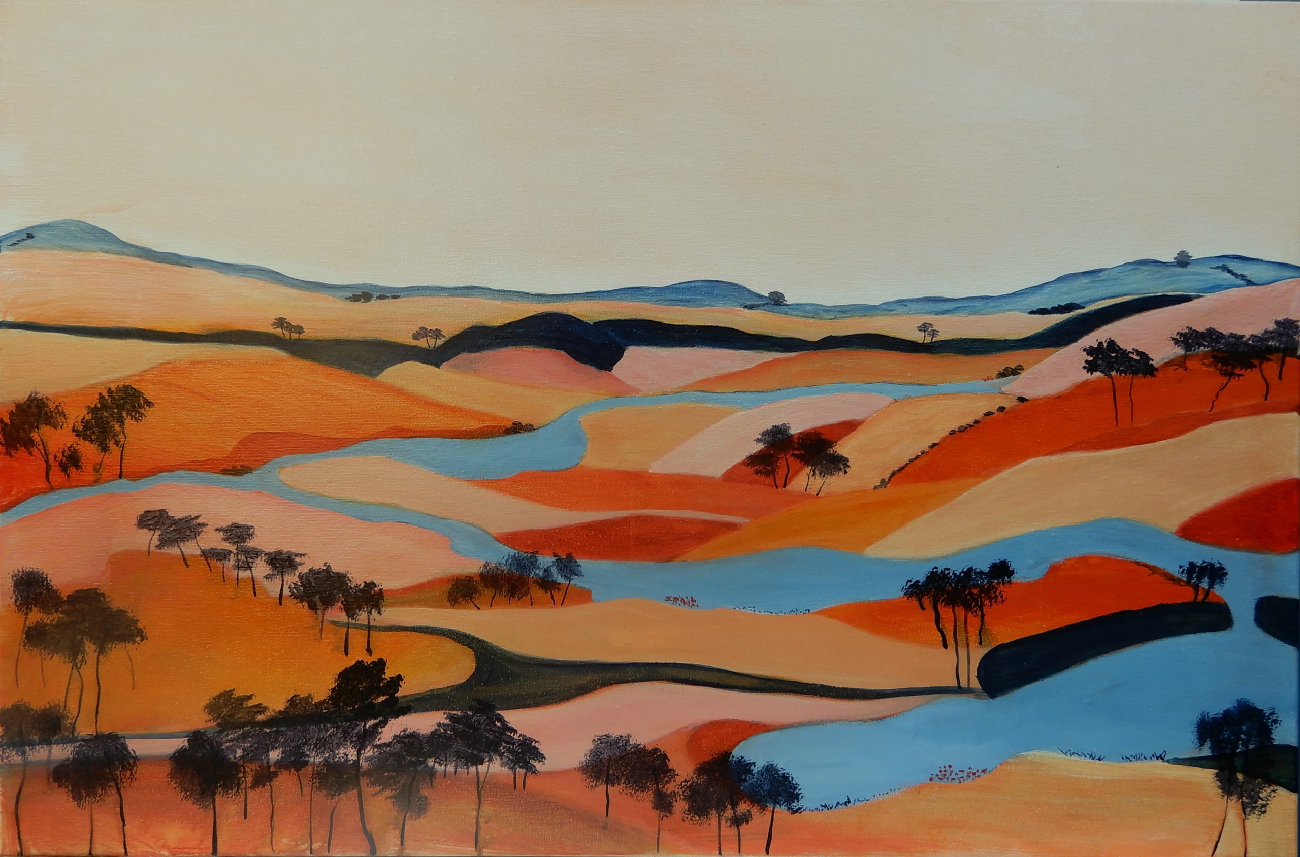 This landscape explores rhythm as a river winds its lazy way through hills and dunes, with colours inspired by the outback.