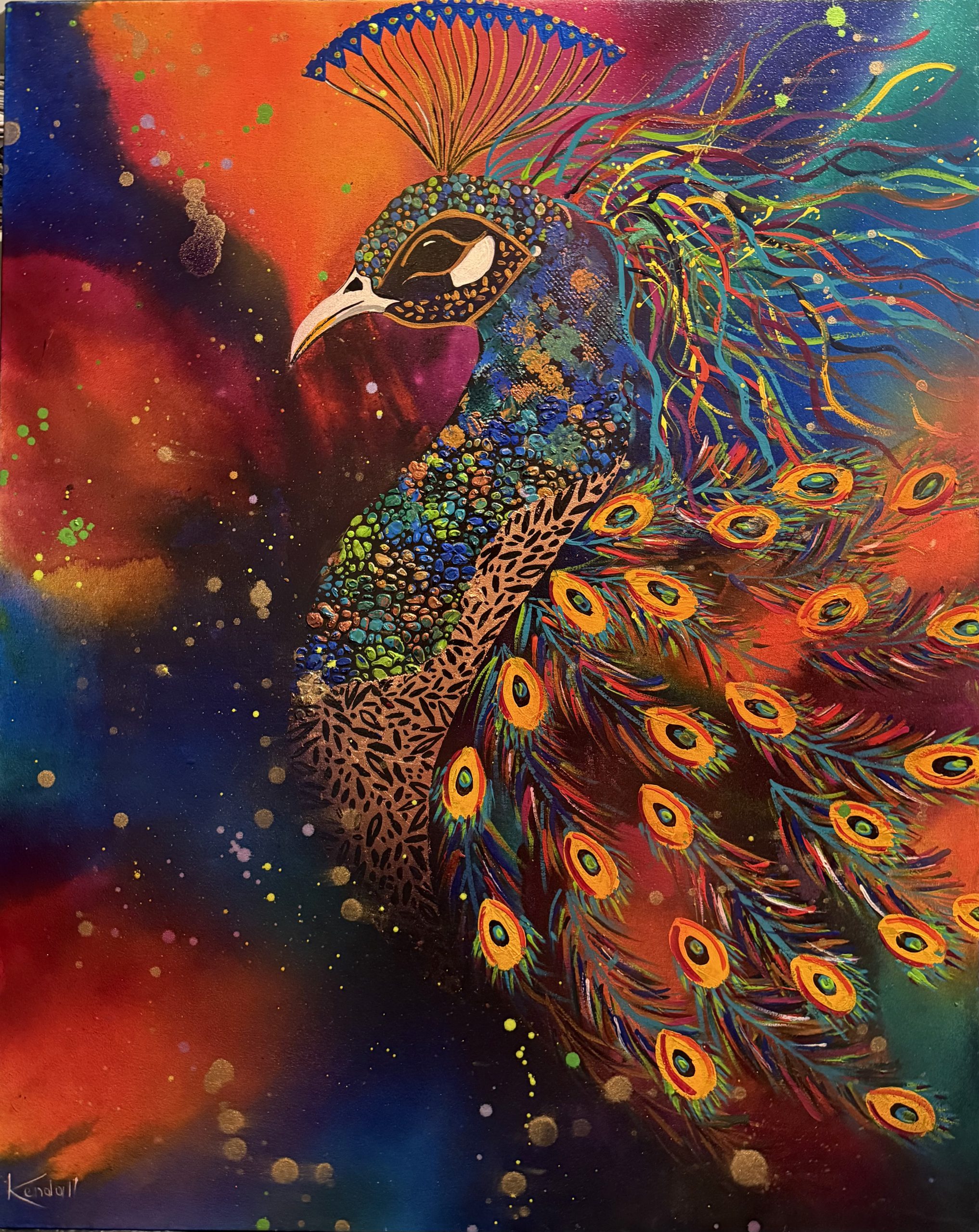 Sir Sapphire by Kendall Perkins – This bold and bright peacock has been crafted with lashings of bright acrylic paints and inks, creating a dance of chaos on the canvas. I have always adored peacocks and have spent much of my career replicating their bold beauty within my artworks.