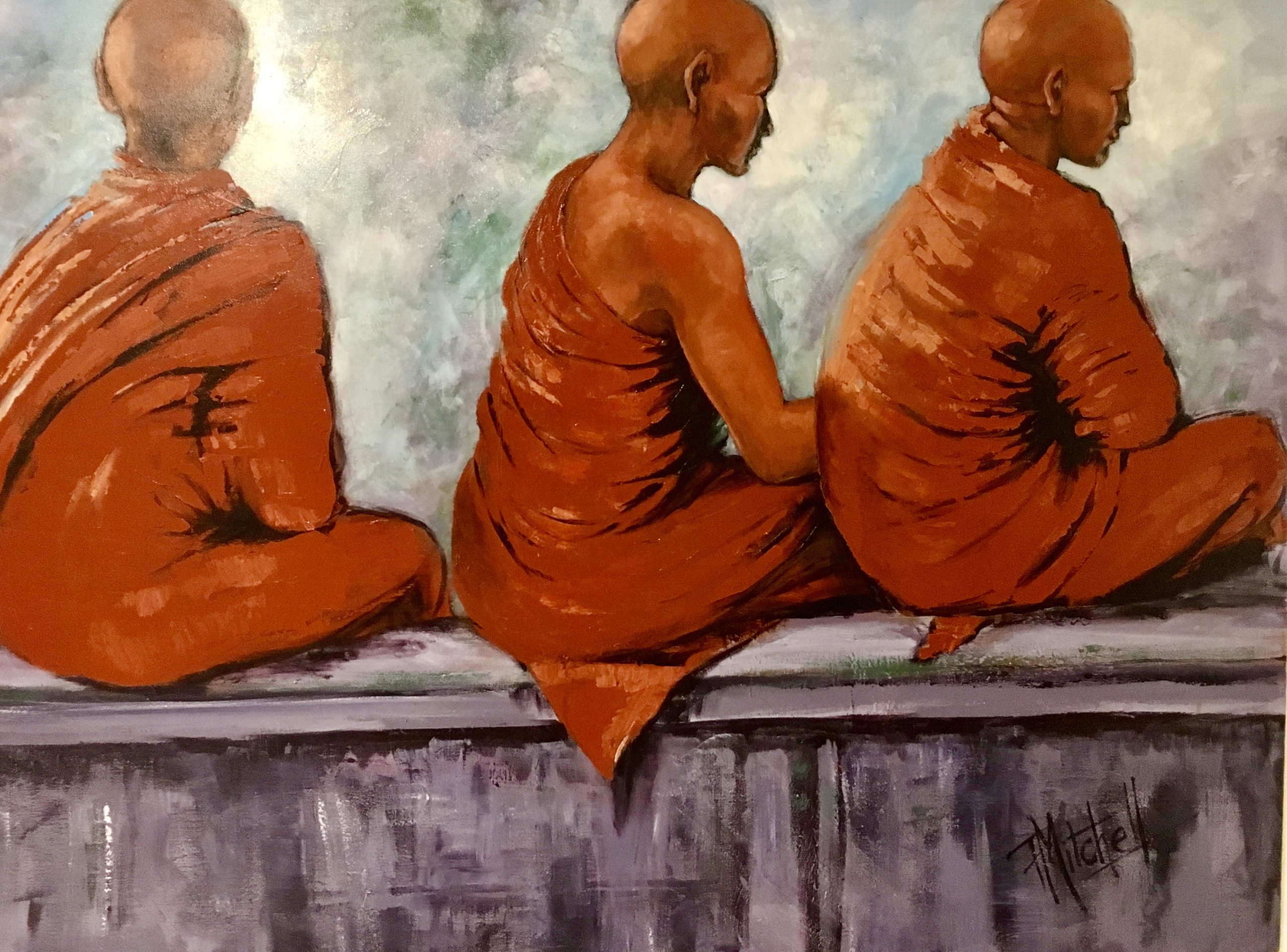 This piece, ‘Sitting on the Fence’ was envisioned during a return visit to Laos where the monks were very apparent daily in the streets and in every part of life in Luang Prabang in Northern Laos where she was staying.