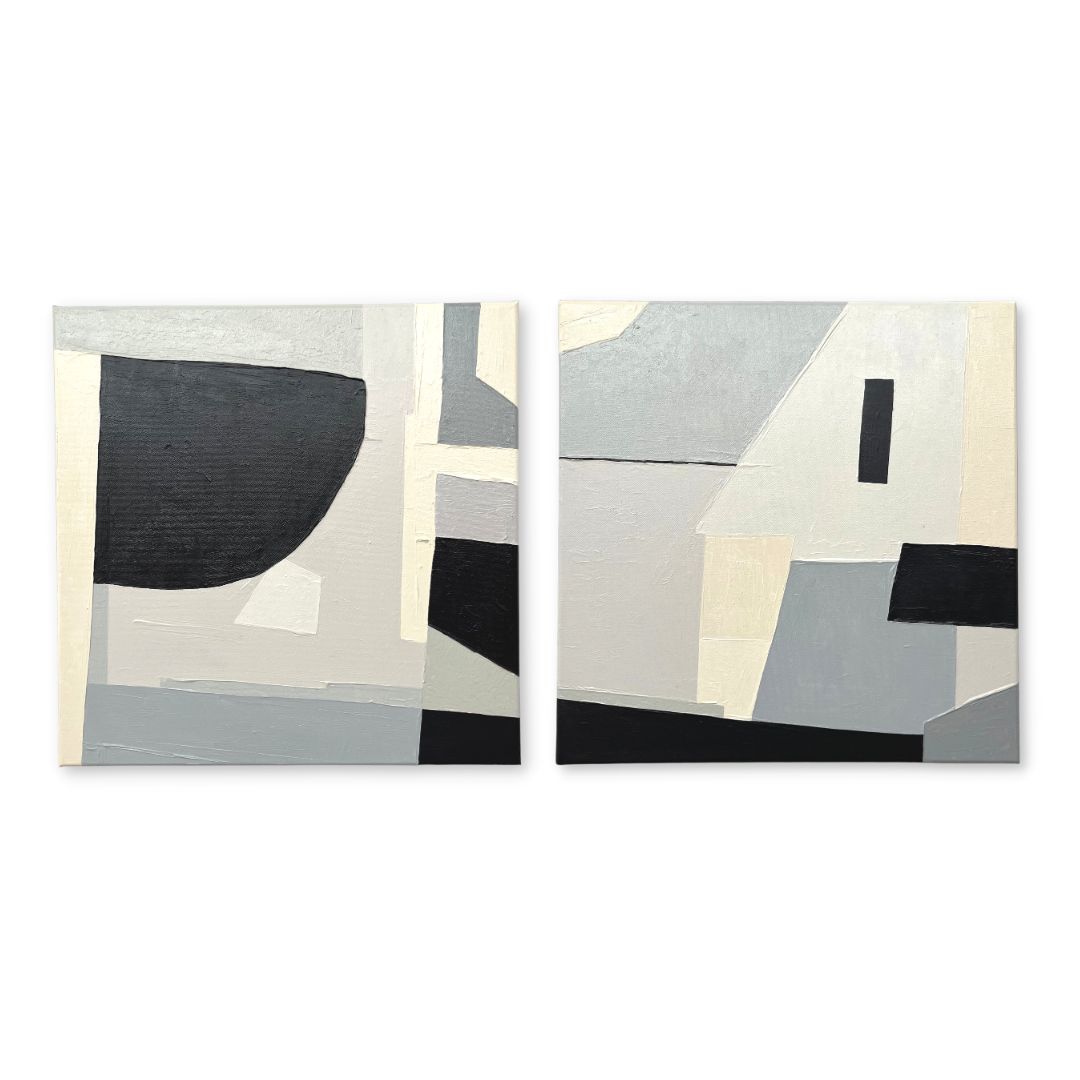 Sitting Still by Dessie O’Gorman – An original set of two abstract paintings, with mild textured depth. In dark navy, beige, and grey shades.