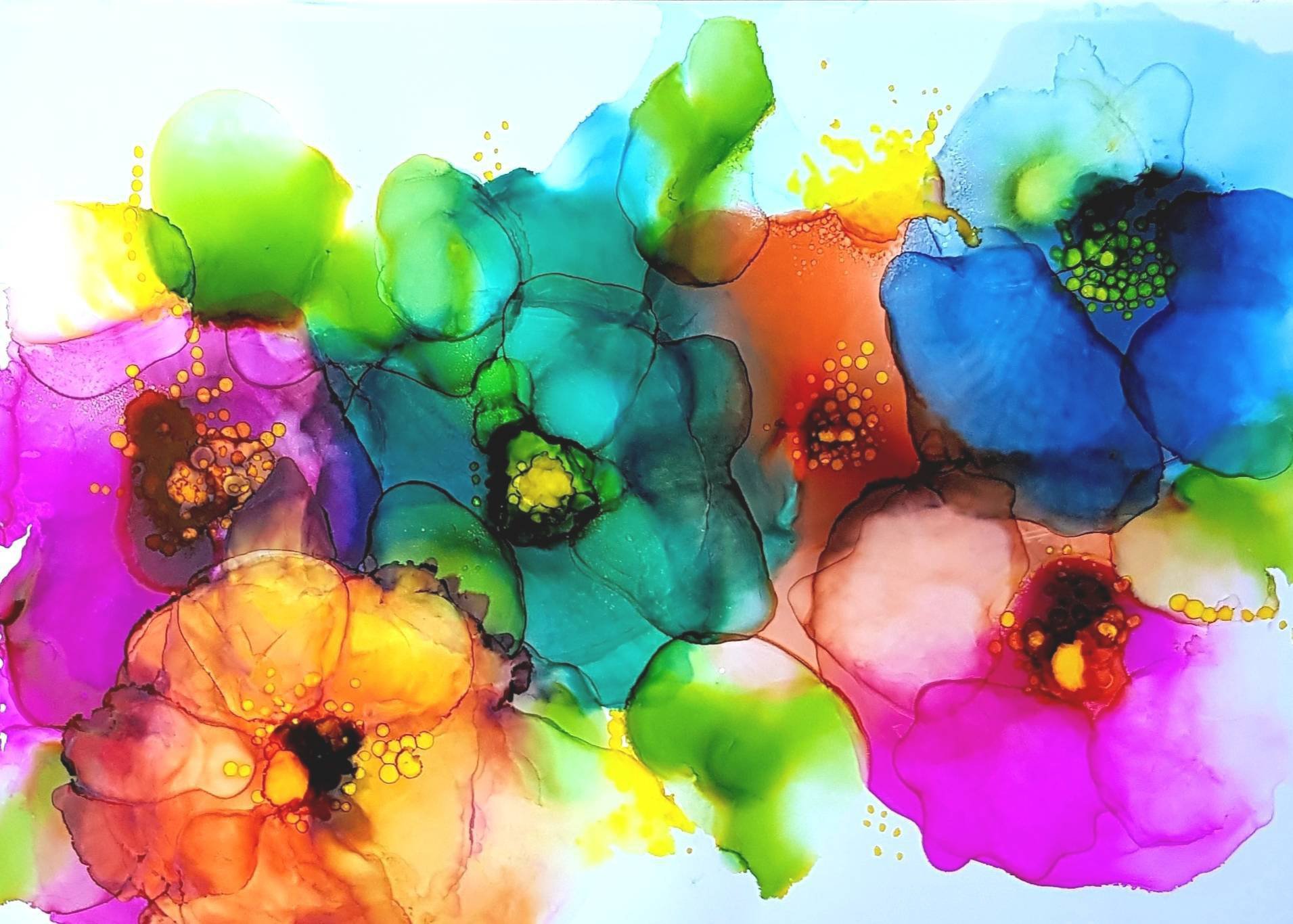 It is a hand worked, original, alcohol ink on yupo paper. There are no digital applications or brushes used to create this artwork. The colours are vibrant – pinks, greens, blues and oranges. My ink techniques uses the natural movement of the medium as it mixes with alcohol, or by blowing puffs of air onto the ink, or by tilting the paper, allowing the ink to run in the direction I want.