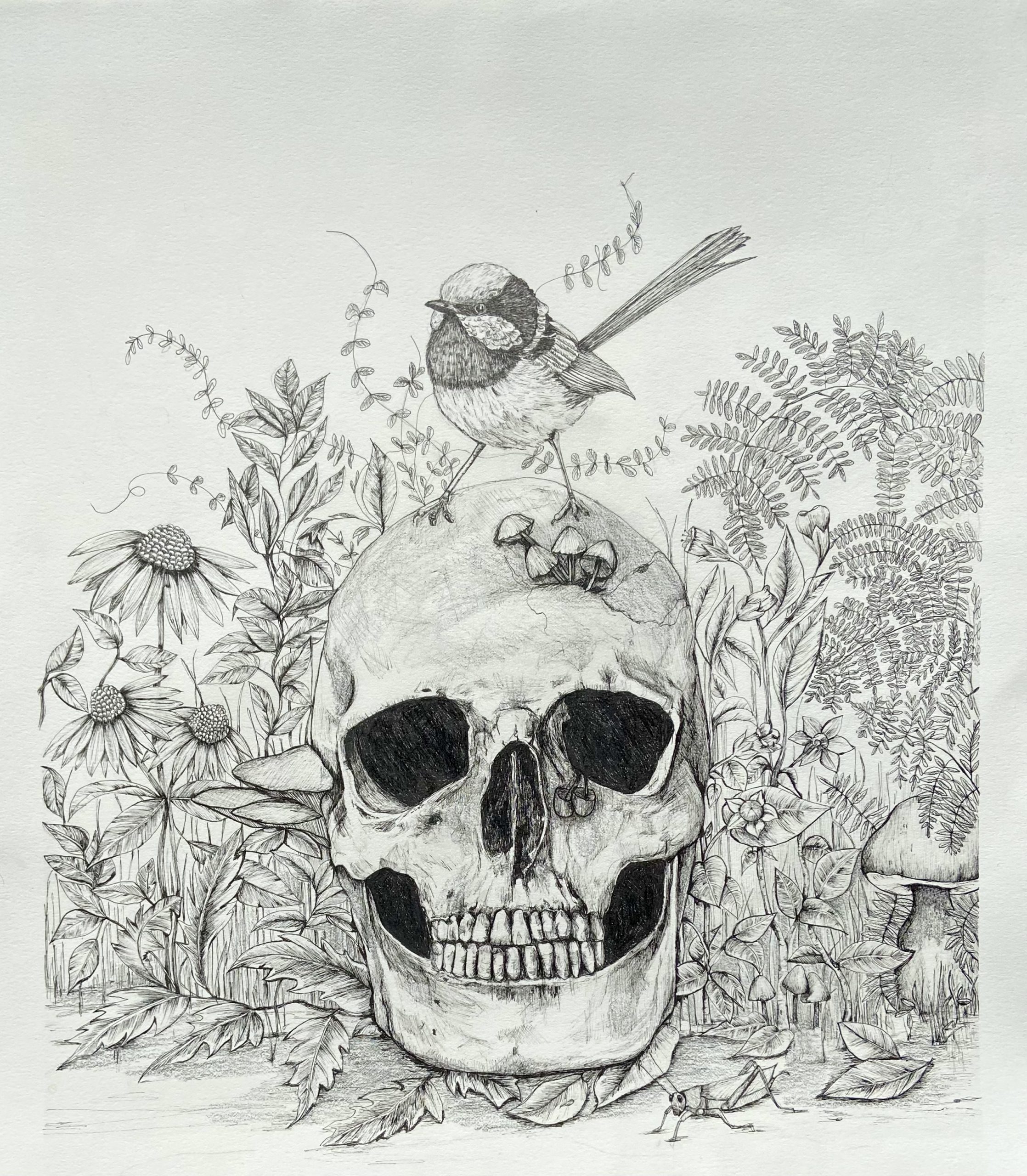 This is a drawing of a Skull situated in a natural setting with a Wren and plant life all around it, representing the cycle of life.
