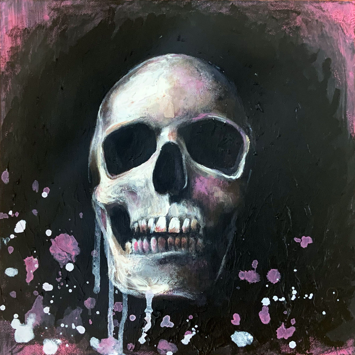 Skull (Resurrection in Pink) – A modern painting of a skull, by Sydney artist Leni Kae with rose quartz feature.