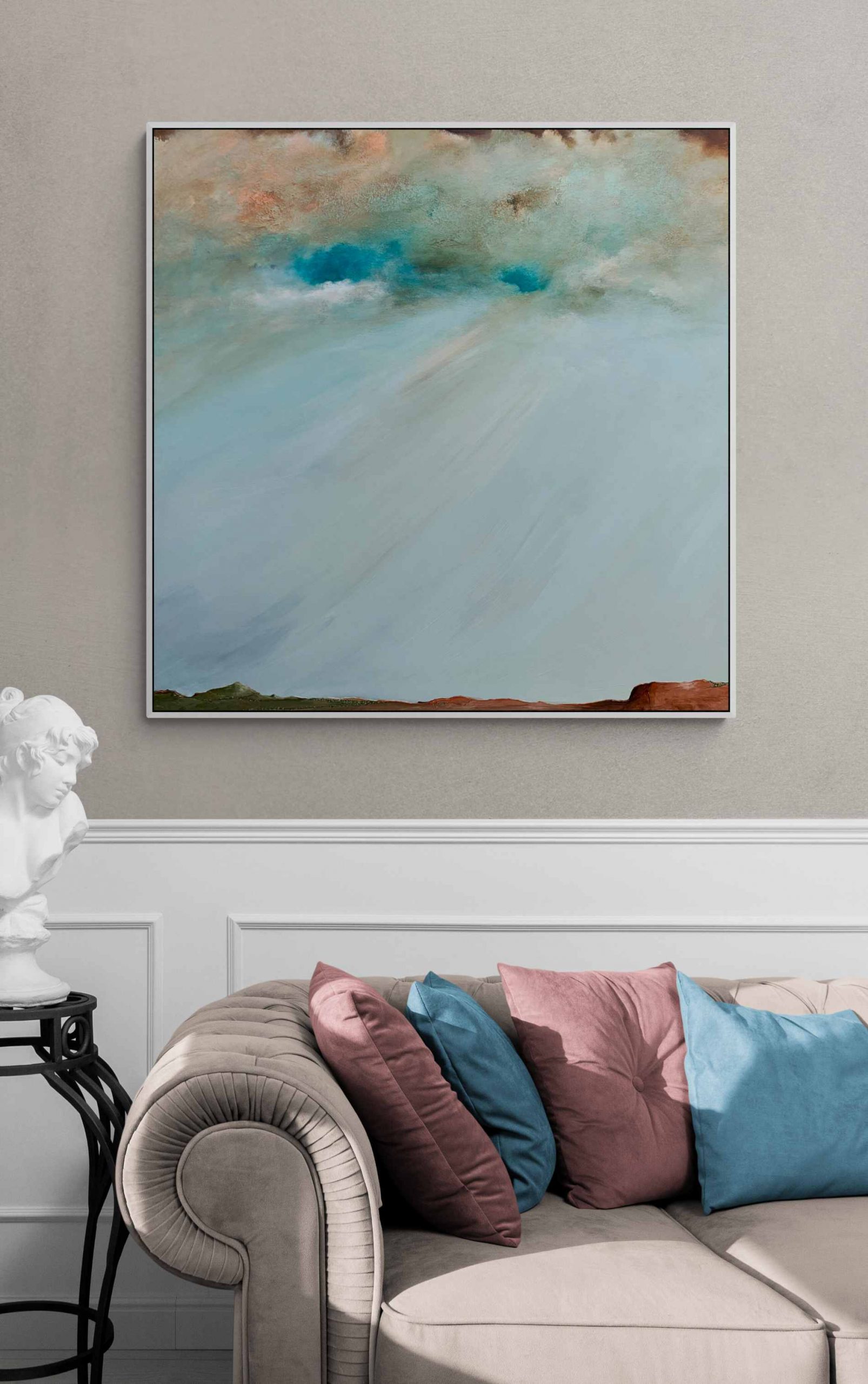 Sky Above The Plains by Tania Chanter is inspired by the atmospheric Australian sky and the changes of light and mood throughout the day. Tania’s hope is that this painting brings a sense of calm to the room where it lives, and that is makes the people who enter the room feel as though a part of nature is right there with them.