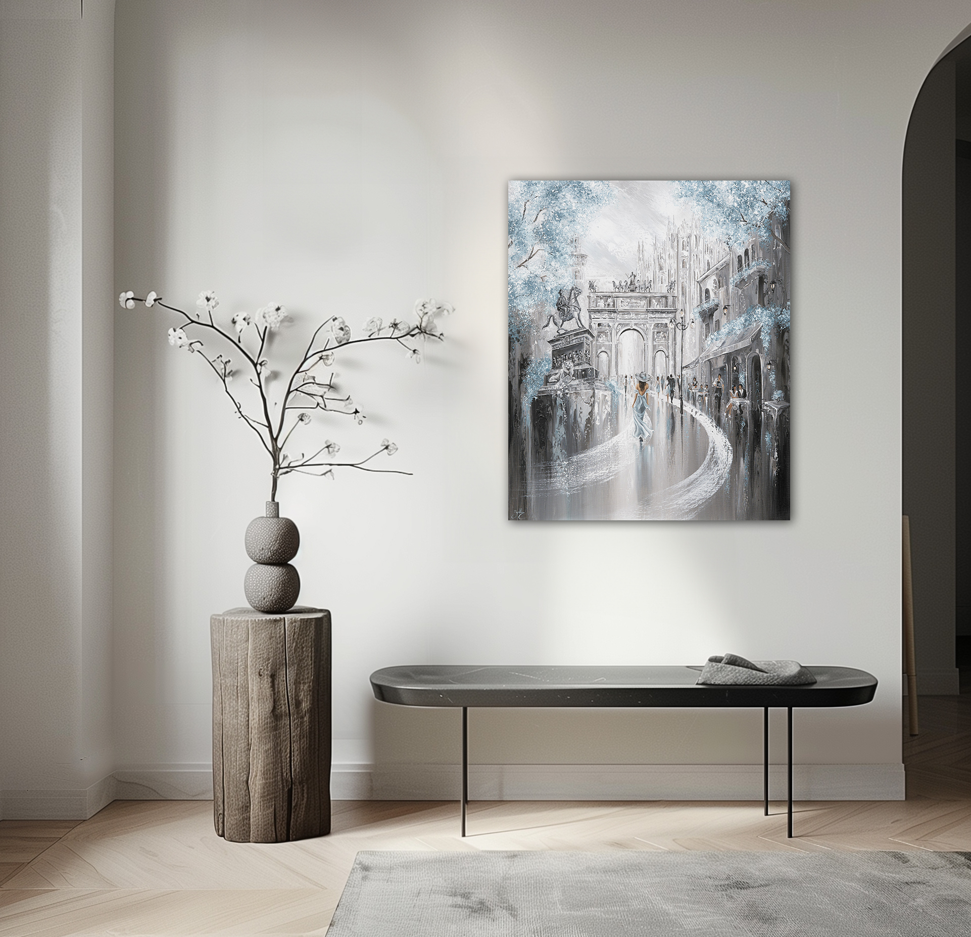 The city hums softly as she wanders through the enchanting streets of Milan. A gentle breeze weaves the scent of fresh espresso from the café, its doors open wide to embrace the morning’s dreamers. The sky shimmers with a soft blue hue, its light filtering through the delicate trees like whispers of a story untold. In the distance, “Leonardo’s Horse” stands in silent grandeur, a steadfast guardian of a city rich in history and grace. Milan seems to pause, as if this moment.. this walk.. were destined to last forever.