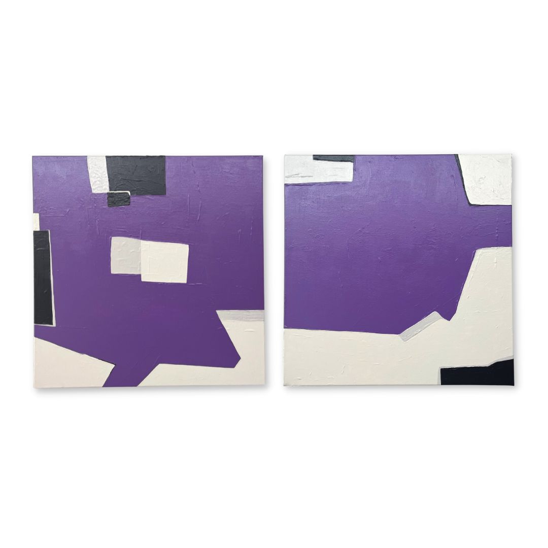 Slow Down by Dessie O’Gorman – An original set of two abstract paintings, with mild textured depth. In purple, eggshell, navy and light grey shades.