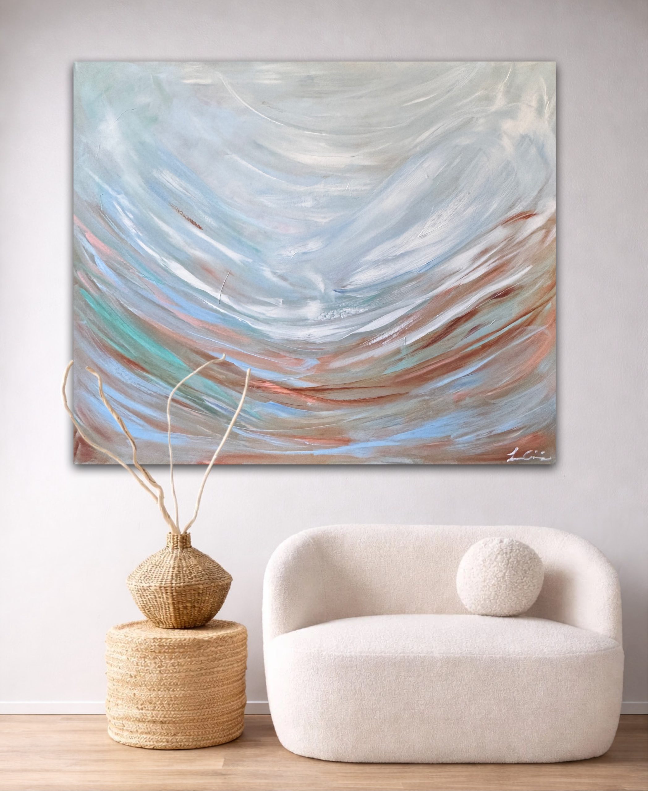 This artwork captures the quiet meeting point between sky and earth. Soft, layered brushstrokes flow gently, blending airy blues with grounded earthy tones. It’s a piece that invites stillness and is designed to bring a sense of balance and quiet movement to any space.