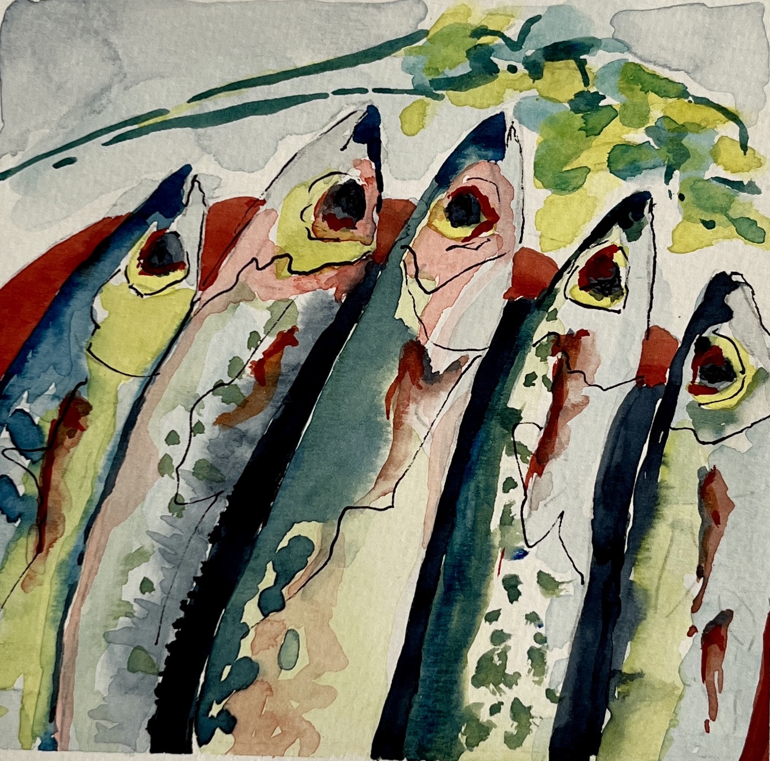 Experimenting with jewel-like coloured skin on fresh fish on a small scale. Soon to meet their fate in the grill.