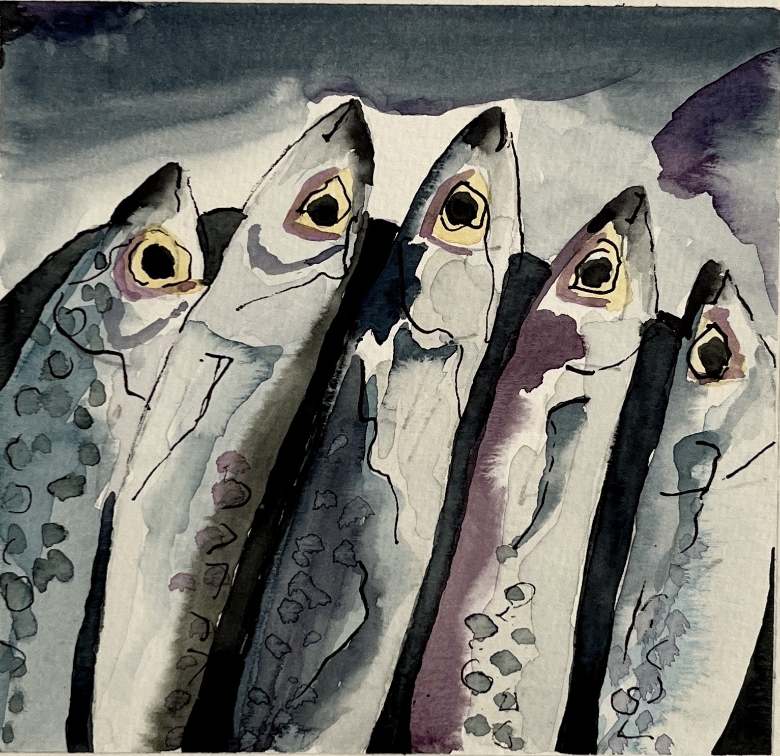 Experimenting with jewel-like coloured skin on fresh fish on a small scale. Soon to meet their fate in the grill.