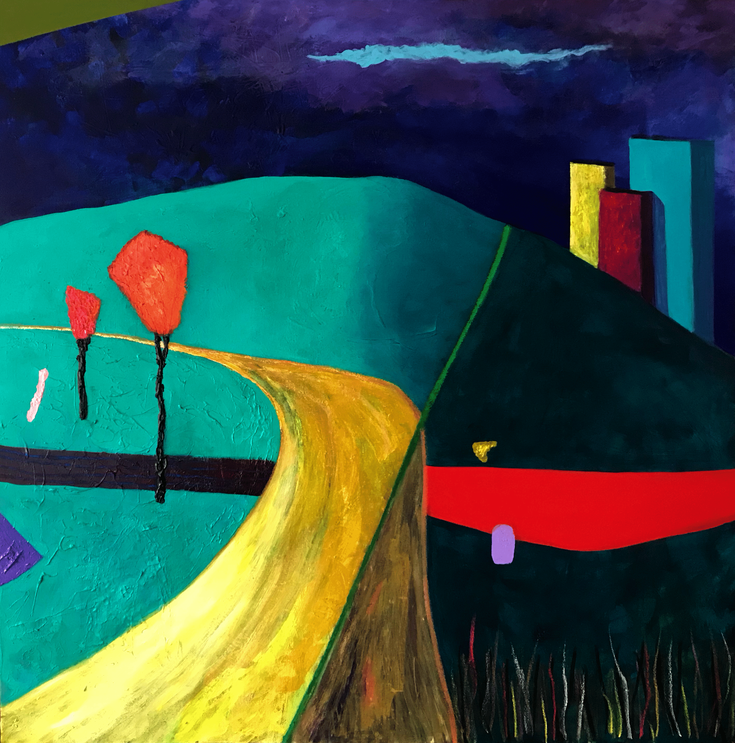 This is my latest painting where I draw inspiration from Australian artist Jeffrey Smart with this semi abstract work. This piece is not meant to be a realistic landscape but it is an authentic distillation of my feelings for the land but with colourful motifs to enjoy. These suspended shapes, which may be unrelated, I need for expressive compositional placement and islands of colour.