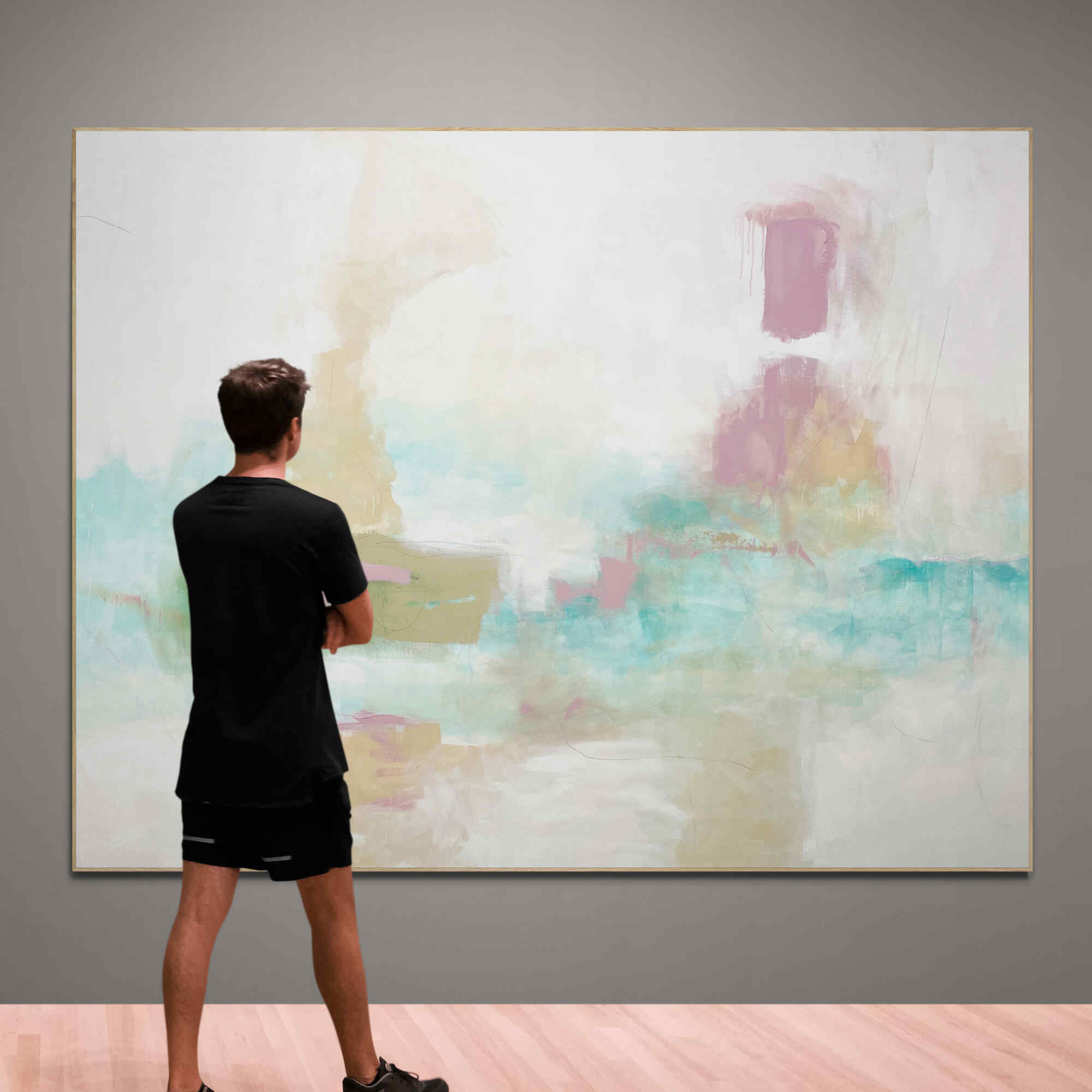 Smoke And Mirrors is a beautiful oversized statement painting perfect for any large space. It has a subtle palette of light warm beige and pink, with large areas dreamy greens against bold rhythmic marks in white and grey pencil.
