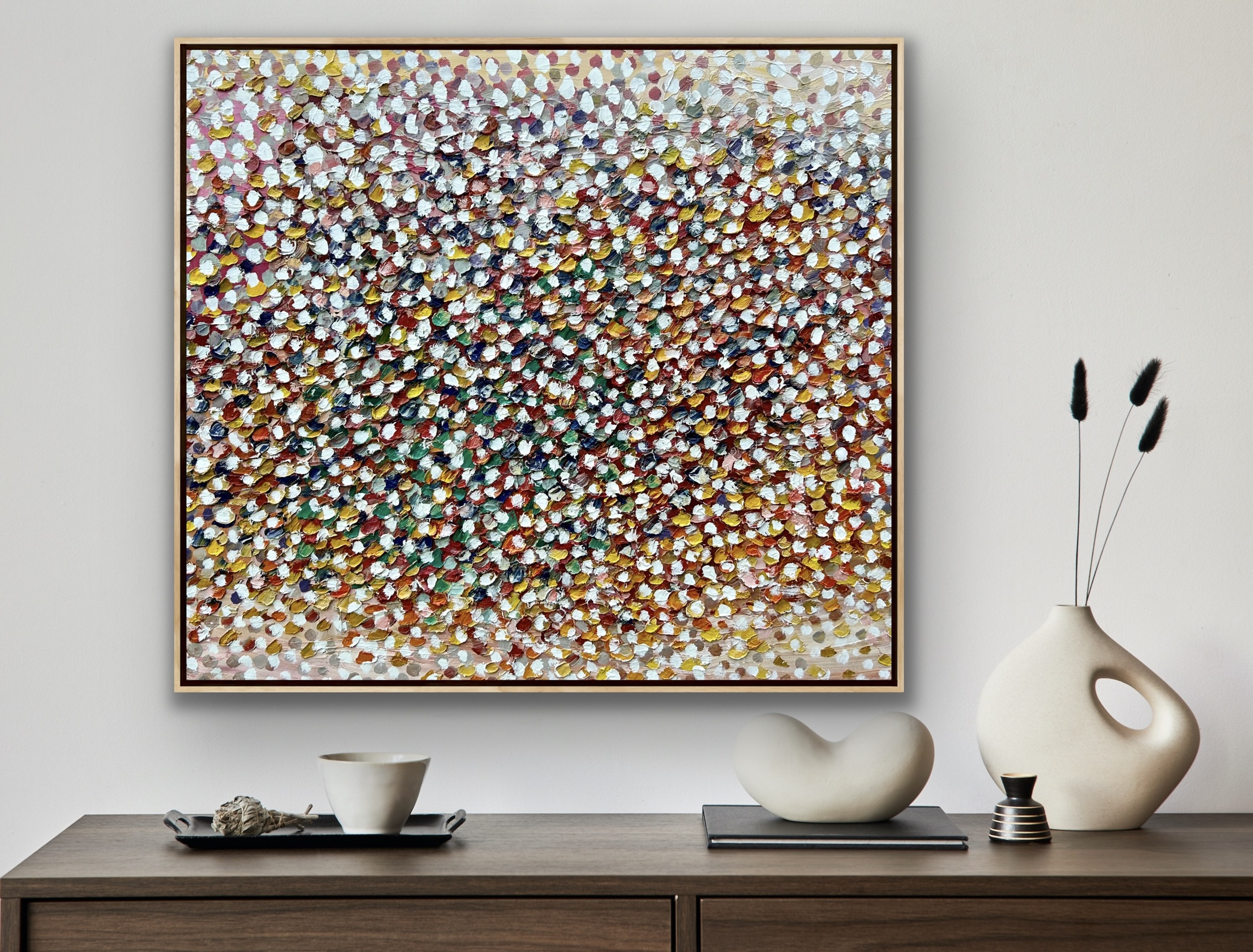 Snow Flakes by Theo Papathomas –  a painting of beautiful bouquet of petals and snow weeping on to the landscape making it a very cool painting with white colours. Petals and snow are painted in thick rich oil paints with a pallet knife and brush to capture the richness of the colours of the petals and to give a lot of depth to the painting. Petals and snow mix together creating a veil of colours, dancing over the land. Hope with this s work it makes the viewer feel very peaceful and tranquil. The painting does not come with an external frame.This painting is signed and dated 2022 at the back of the painting and comes with a certificate of Authenticity.