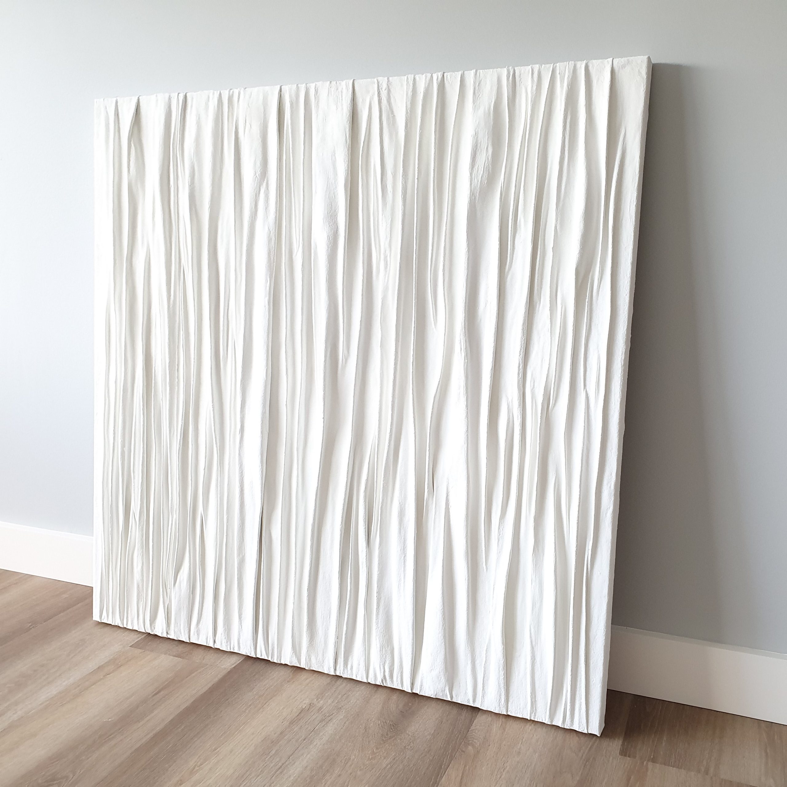 This artwork has been created by dipping linen fabric in a plaster mixture and arranged on an canvas board in different patterns .