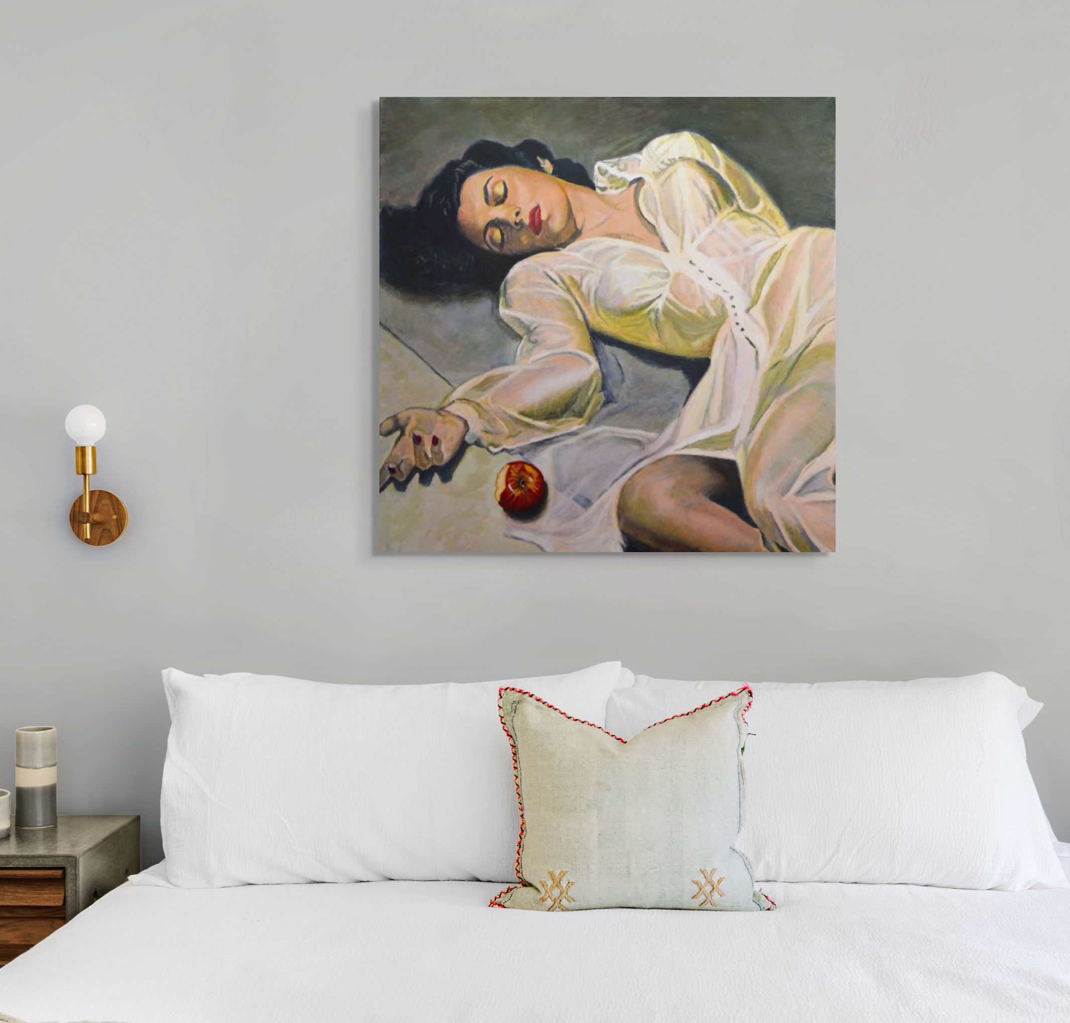 Snow White is an original painting by Jane Ianniello. In the traditional Snow White fairy tale by Brothers Grimm, the evil Queen’s vanity and jealously drives her to try to kill the innocent Snow White with a poison apple. Fairy tales shape our values and beliefs, teach us important life lessons, and help us to cope with difficult emotions. The painting is on high quality Create Art stretched canvas with a sturdy pine frame, and is ready to hang with d-rings and picture wire. It measures 102cm x 102cm x 3.8cm. Jane will courier in a professionally packed, sturdy cardboard box.