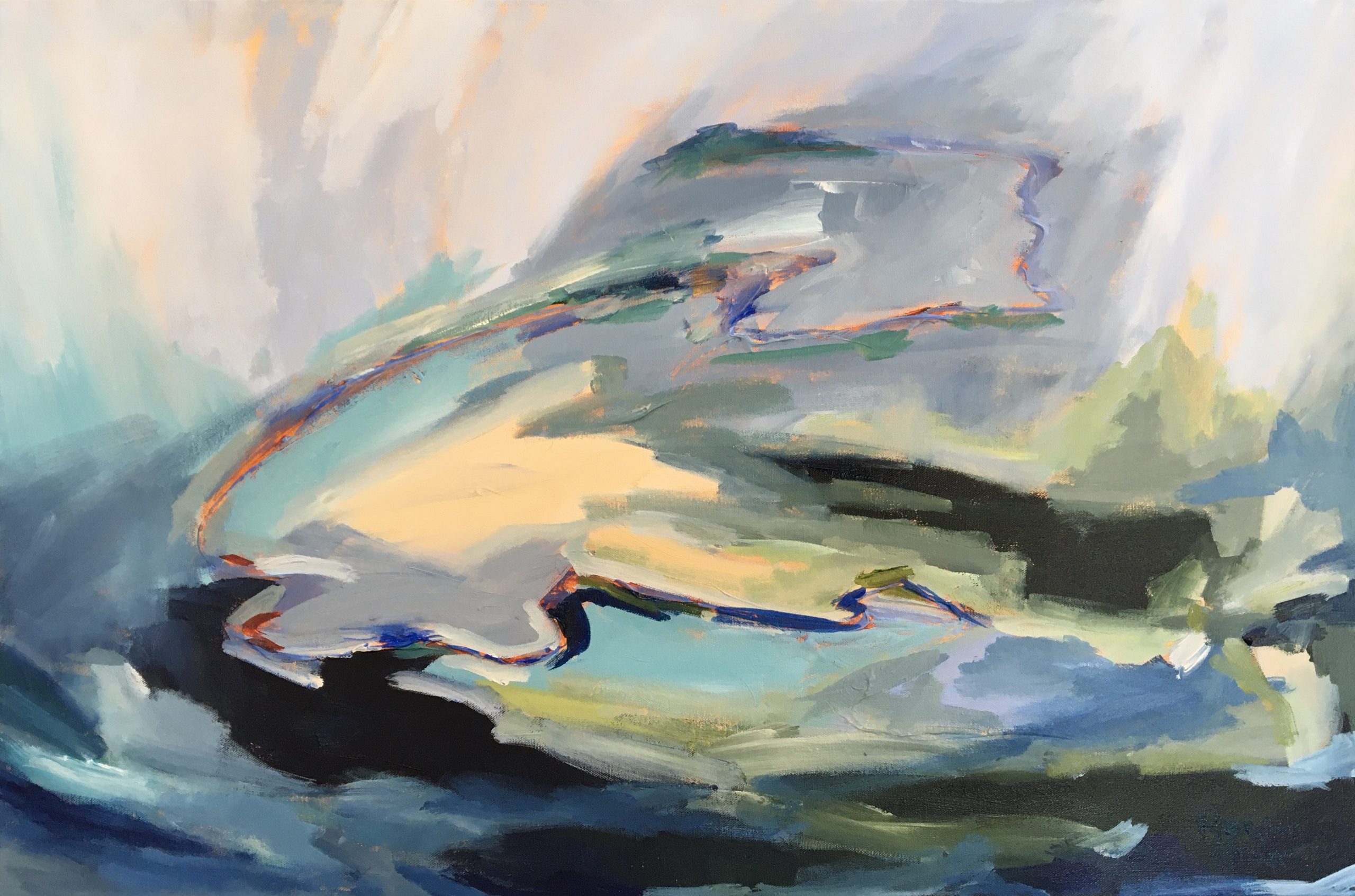 SOLD Snowy River artwork by Meredith Howse. Forms part of new and exciting series of artworks by Meredith Howse. Inspired by the colours of the countryside comes a sophisticated collection of abstract landscapes. Using rich deep greens, earthy browns and warm ochre’s, with a splash of blue to symbolise our rivers, dams and blue sky’s. A birds eye view point on a textured, well primed canvas. Connections are made between colours and lines.