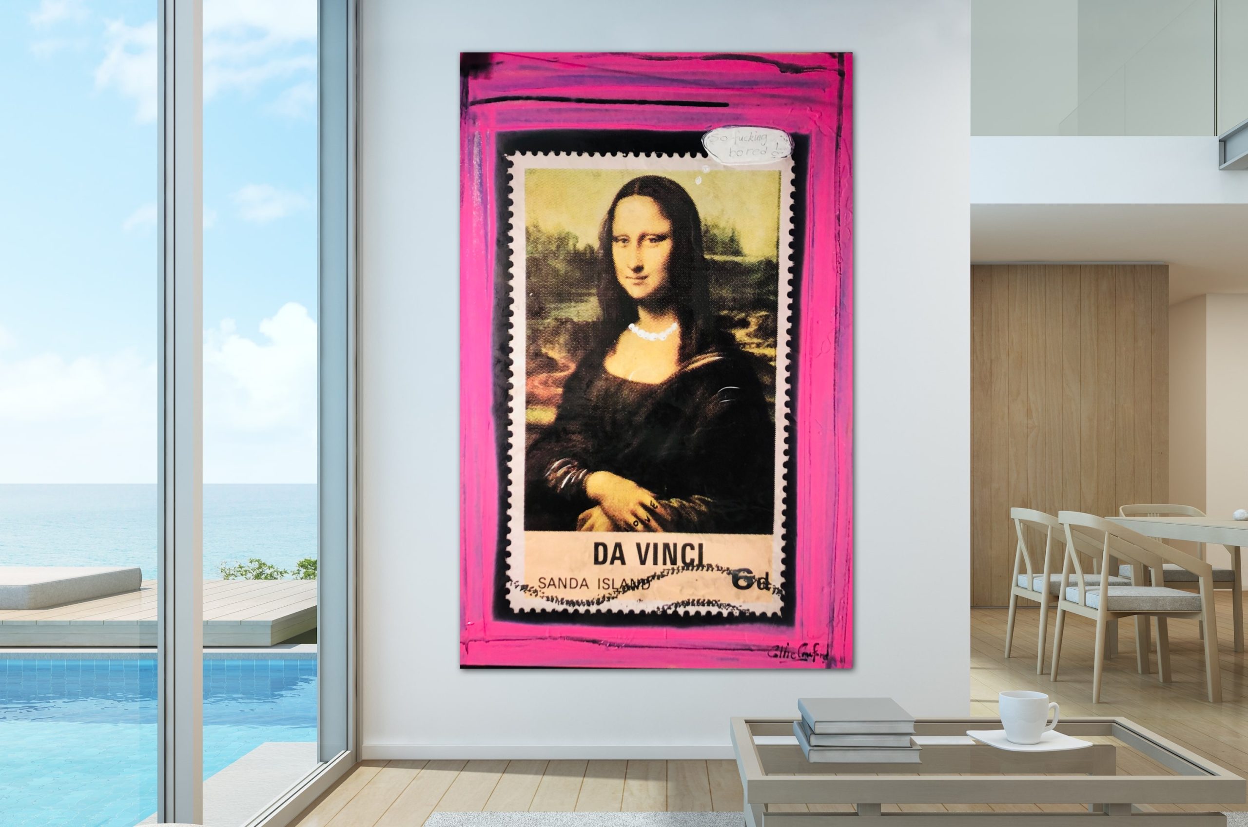 So F#%king Bored by Colin Crawford – This was a great piece to create, I have always loved working with mixed media. This piece is kind of pop art street art . Mona just sits there bored off her mind . I gave her a hand tattoo and a pearl necklace to make her pop .