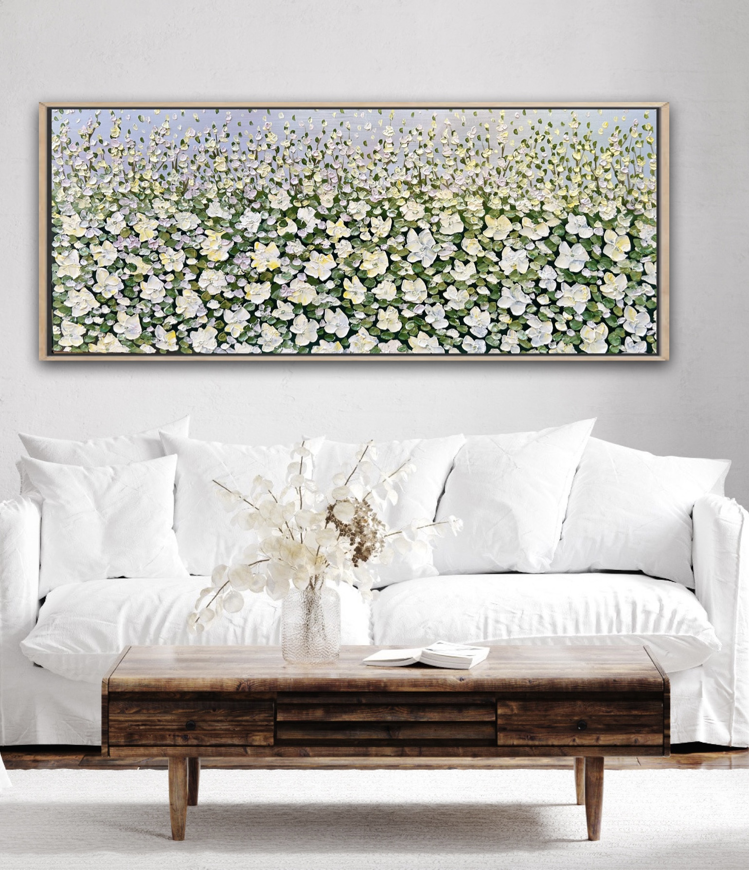 So Glamorous by Theo Papathomas  a painting with beautiful yellow colours of gardenias and petals covering the whole field painted with lots of expression and freedom to create movement. Capturing the soft colours of the gardenias and foliage creating a beautiful bouquet of gardenias . A composition of colours and rhythms of petals dancing over the landscape swept by the winds . Painted with a pallet knife to create so much texture with lots of layers of paint . A very peaceful and tranquil painting with so much depth . The painting does not come with an external frame.The painting is signed and dated at the back and comes with a certificate of Authenticity.
