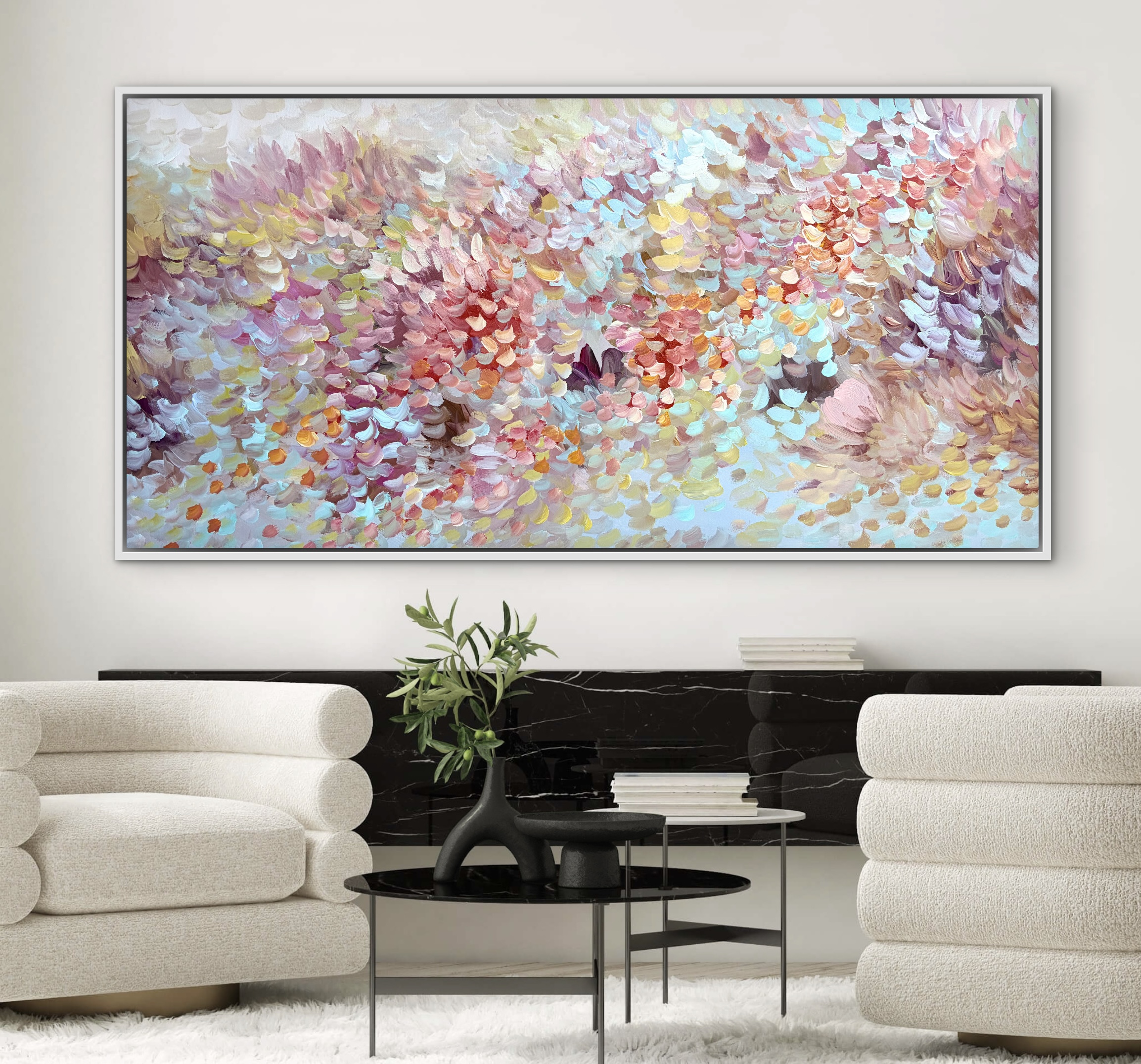 In this piece, I poured vibrant emotions into every acrylic stroke, blending abstract form with impressionistic softness. The swirling blooms represent joy and renewal, capturing the fleeting magic of nature. It radiates warmth and uplifting energy, perfect for bringing a sense of hope and serenity to your space. Every flower dances with life and light, inviting you to feel alive and inspired. This painting does not come with an external frame.The painting is signed and dated at the back and comes with a certificate of Authenticity.